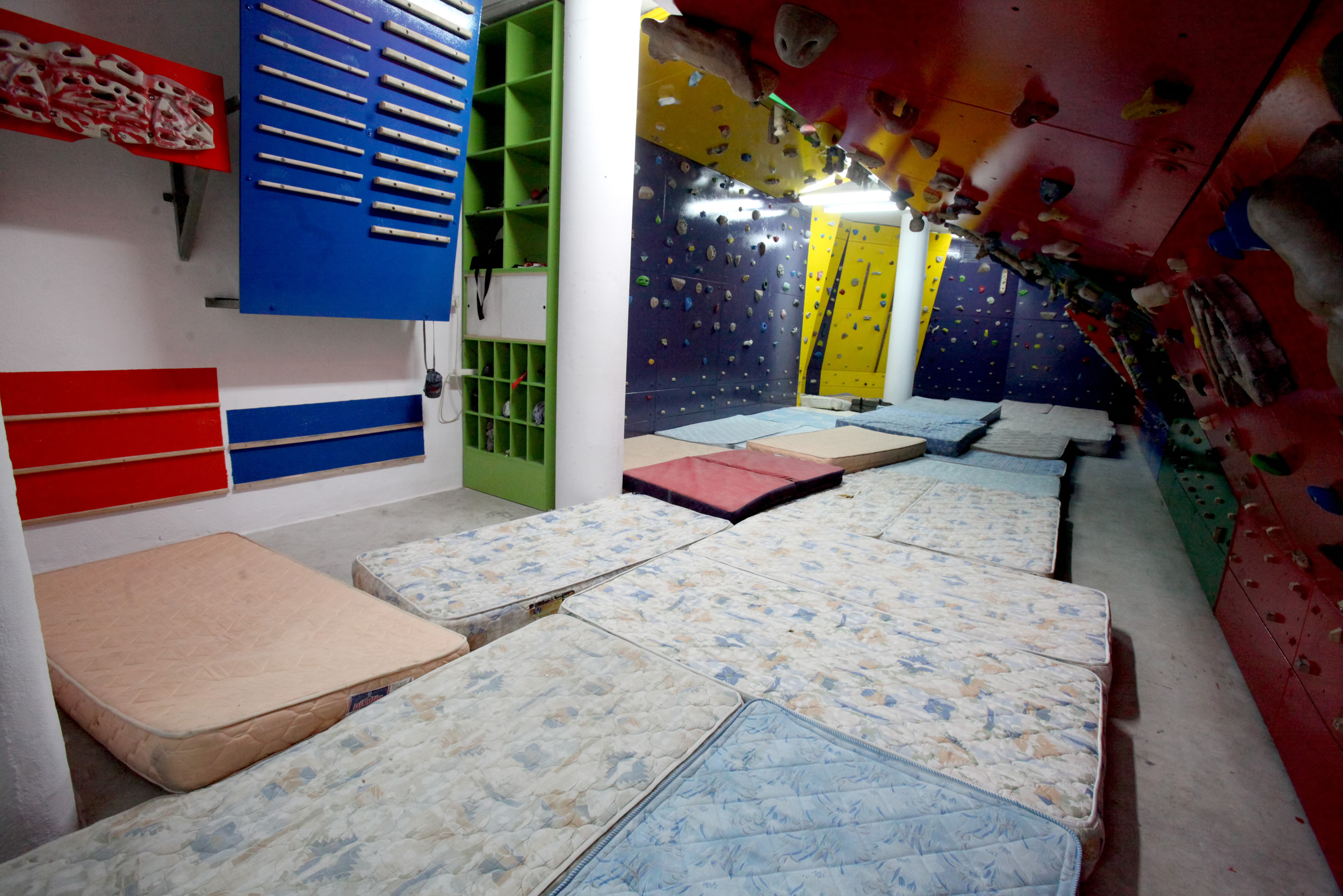 Sala de búlder muy reciente, con 5 desplomes de diferente inclinación de colores y pared vertical. Campus y panel multipresa. Cuerda para subir a pulso. Biblioteca ténica.