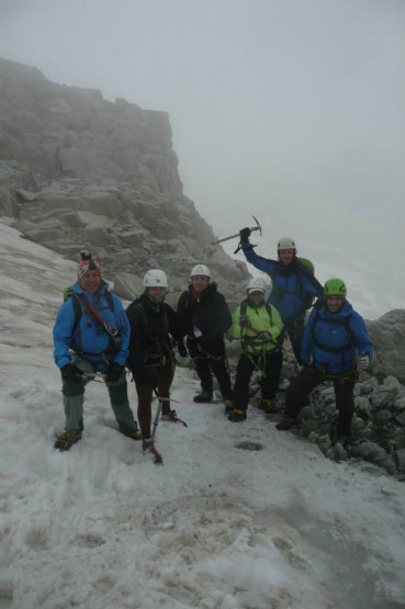 En una buena pala de nieve se han podido trabajar los anclajes en nieve con piolets, palos, raquetas, etc.. además de hacer los anclajes con piolet recuperable. Por último, hemos hecho un aseguramiento con trono y al cuerpo. Y ya para poner la guinda final, se ha filmado un simulacro de rescate.