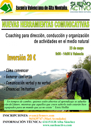 El 23 de mayo, en Laif Climbing de Valencia, se realizará el curso que consta de coaching para dirección, conducción y organización de actividades en el medio natural.