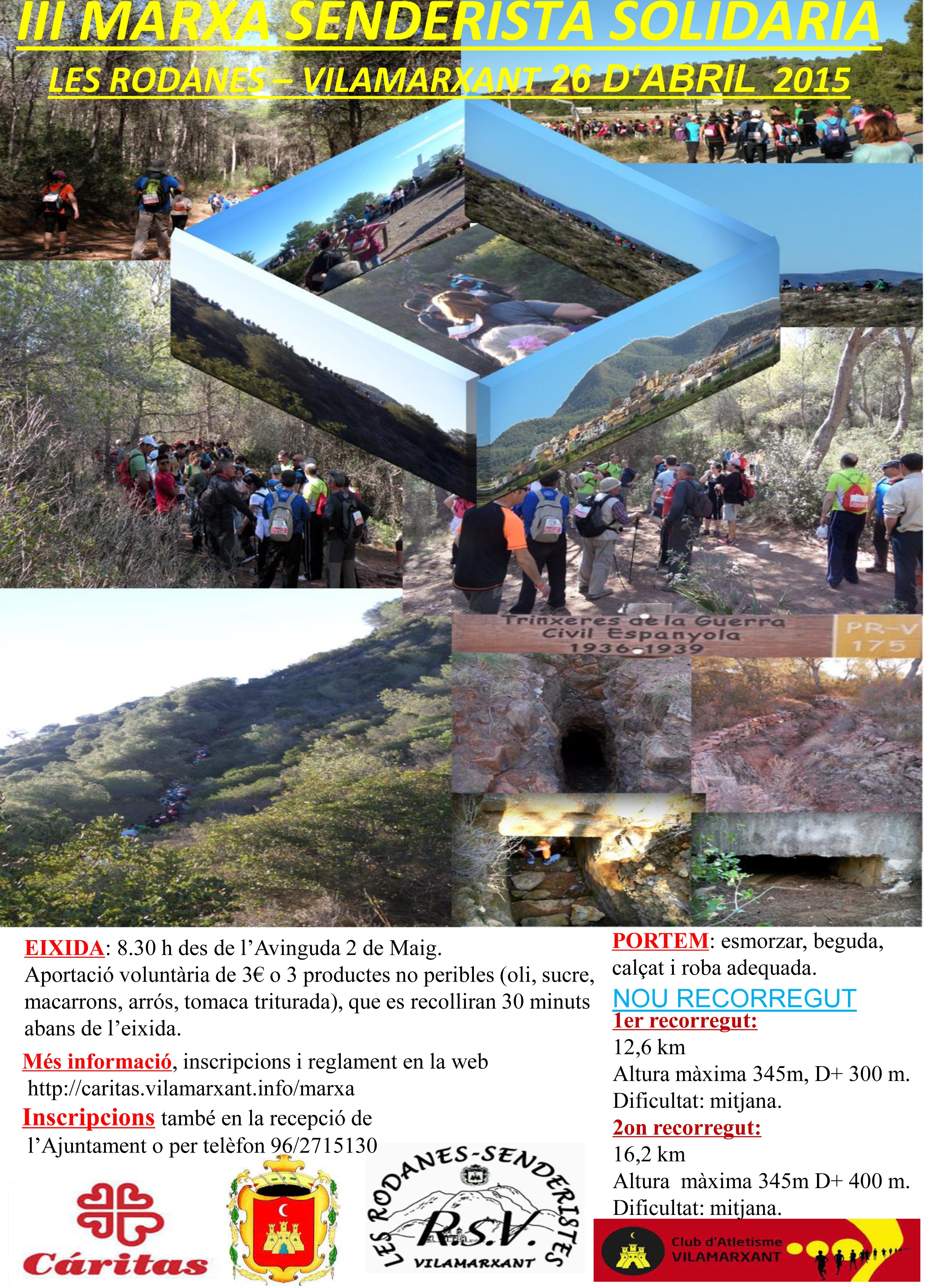La III marxa senderista de muntanya és una prova no competitiva, que pretén fomentar el senderisme i al mateix temps passar un matí gaudint de la natura, dels amics i de la família; a més a més de donar a conèixer una part important de la muntanya de Vilamarxant. Però el més important és poder aconseguir realitzar una marxa solidaria, per la qual cosa les persones participants no paguen quota d’inscripció. A canvi es comprometen a col·laborar voluntàriament amb 3 productes d’1 kg/l no peribles d’oli, sucre, arròs, macarrons o tomaca triturada o 3€. La marxa està organitzada per l’Ajuntament de Vilamarxant i amb la col·laboració de Caritas Vilamarxant i el Club de Muntanya i Atletisme de Vilamarxant