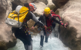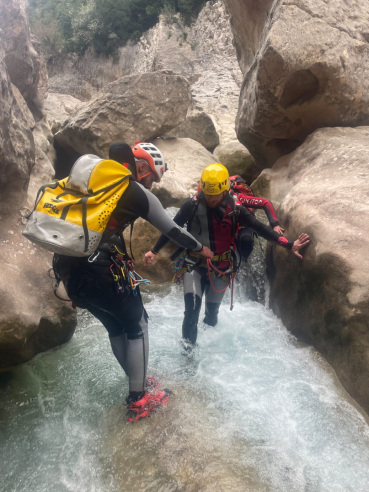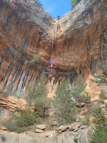 El miércoles 12 de abril se inició la jornada en Alquezar, haciendo una sesión teórica de geografía, cartografía, meteorología, análisis de los barrancos (caudales, ubicación, aplicaciones…), para conocer el entorno en el que transcurrirá la formación durante estos días. También se trató el tema de la seguridad y las normas, de los peligros, los rescates… etc. Después en el Barranco de la Peonera, el alumnado ha practicado en todo momento el guiaje del grupo, intercambiándose los roles. Posteriormente, se ha analizado su actuación y las decisiones tomadas.