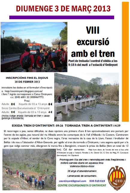 Eixida tren des d'Ontinyent 9:26 hores, tornada tren a Ontinyent 14:39 hores.