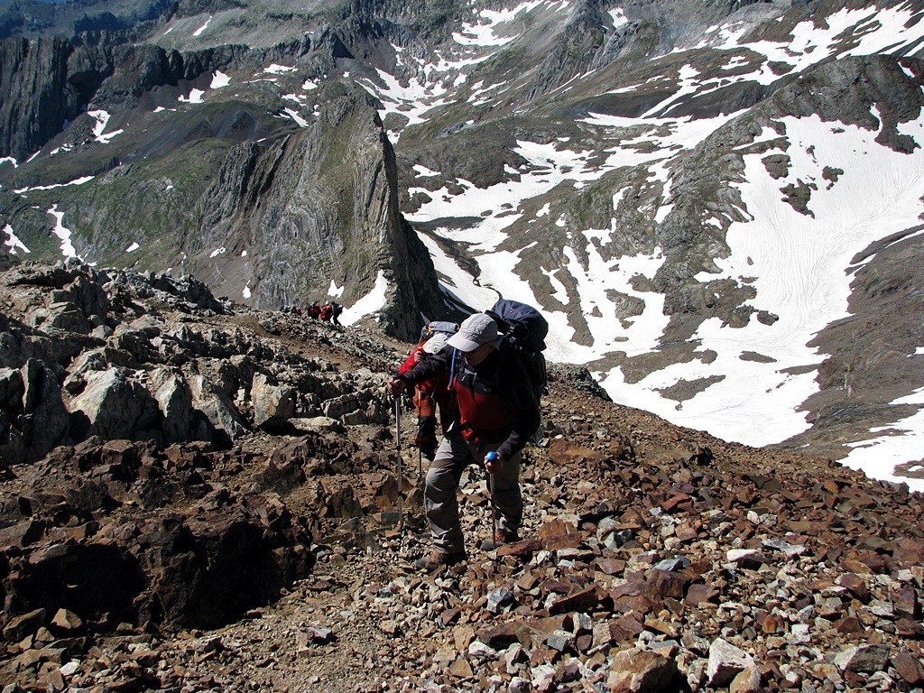 Desde este último refugio se ascendió el Pico Posets (3375 m), segundo pico más alto de los Pirineos tras el Aneto. Todavía con bastante nieve en la canal de entrada hubo que usar piolets y crampones hasta el Collado del Diente.