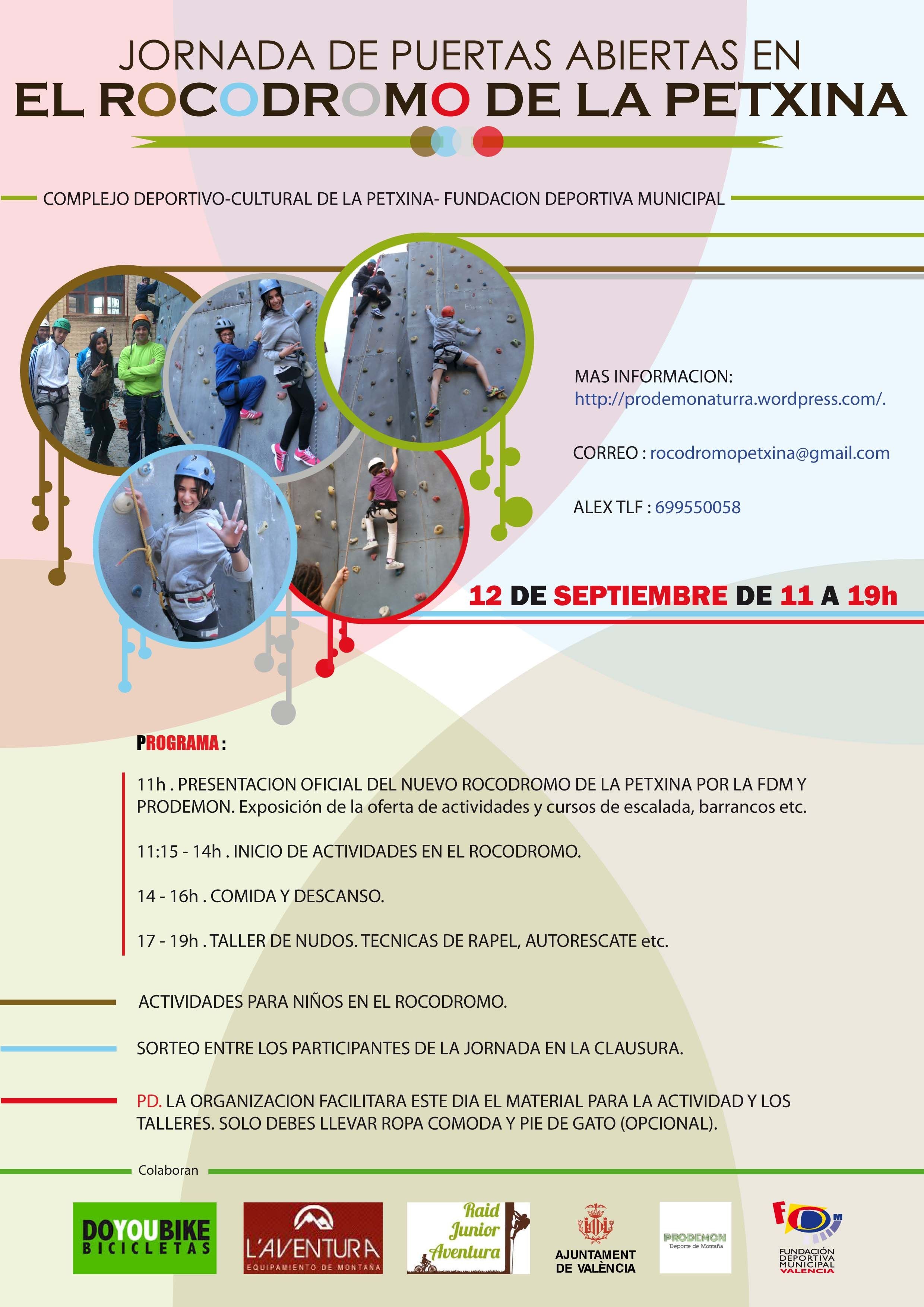 La Fundación Deportiva Municipal de Valencia ha reformado el rocódromo de la Petxina y para darlo a conocer organizaremos una Jornada de puertas abiertas del rocódromo que tendrá lugar el sábado 12 de septiembre de 11 a 19h de carácter gratuito para todas las edades en "La Petxina".