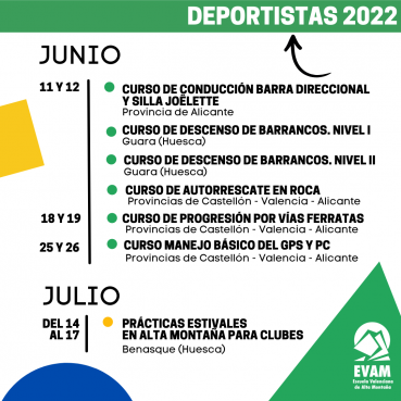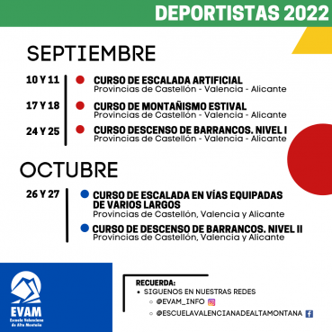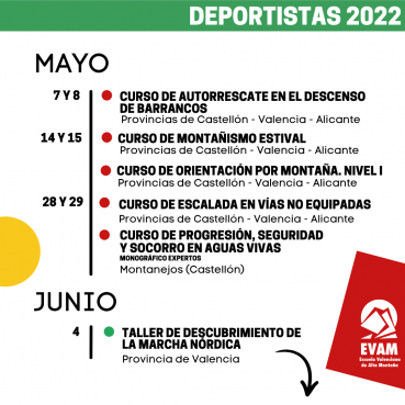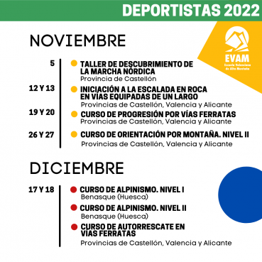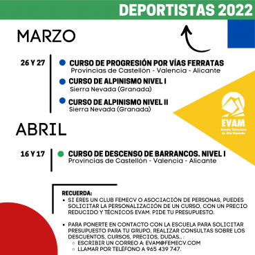También se han incluido nuevos cursos: primeros auxilios en el medio natural y primeros auxilios específicos a las diferentes modalidades deportivas representadas en la FEMECV y esquí de montaña, que completan así una actualización ambiciosa del Calendario de cursos para deportistas EVAM para este año 2022. Próximamente se comunicarán fechas y lugares de realización de estos nuevos cursos.