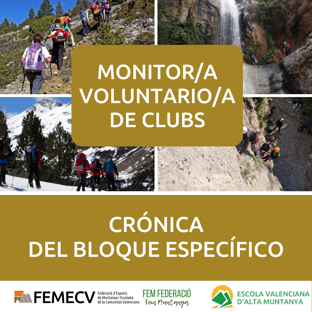 Los monitores voluntarios de Escalada desarrollaron su actividad principal en el sector de escalada de Placas del Sol en el Barranco de la Maimona donde realizaron control de seguridad en las maniobras, manejo de cuerdas, aseguradores semiautomáticos, primeros auxilios, montaje de reunión equipada, chapaje de cintas express, etc. Marta Pérez y Dani Tercero fueron los responsables de la formación.