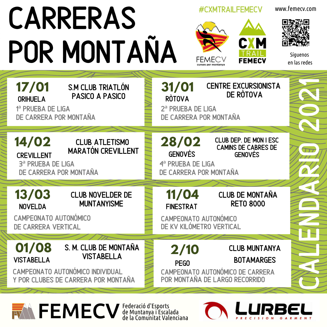 Para estar al día de las noticias de las Carreras por Montaña, puedes visitar el espacio de la Vocalía en nuestra web, así como seguir las publicaciones que se realizarán en Facebook de la FEMECV, en el perfil del Equipo de tecnificación y en Instagram.