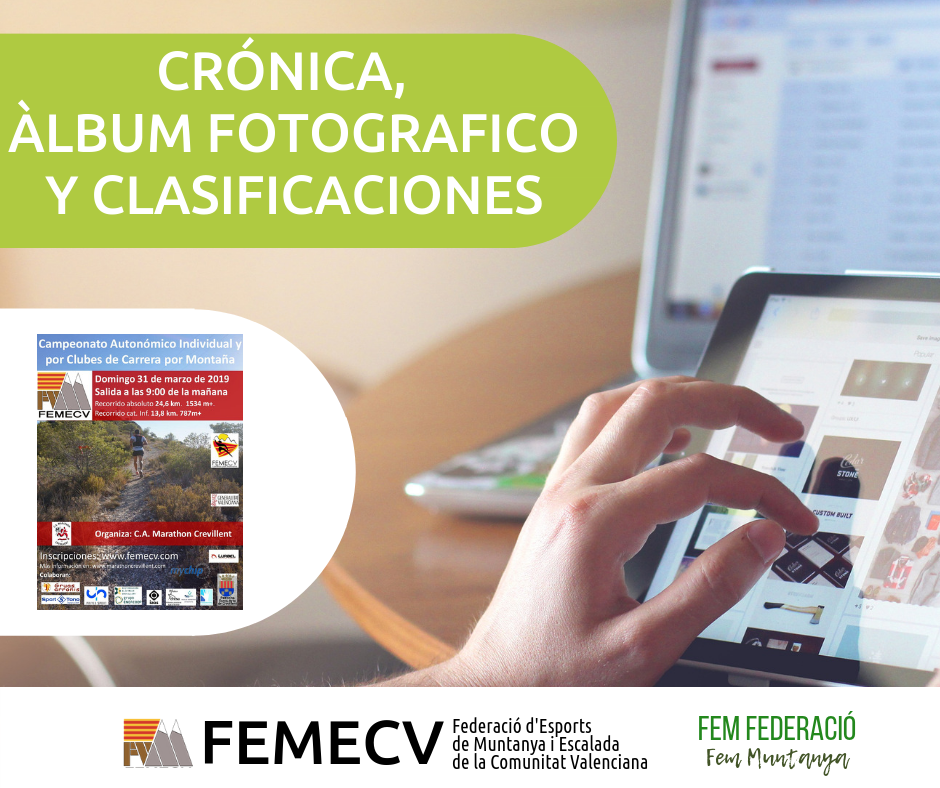 El pasado domingo día 31 de marzo de 2019 en una mañana lluviosa se celebró en Crevillente (Alicante) el Campeonato Autonómico en Línea Femecv 2019 de Carreras por Montaña. Un recorrido de 24,5km y 1.382m de desnivel positivo en categoría absoluta, y de 11km y 618m de desnivel positivo en categoría Cadete/Junior.