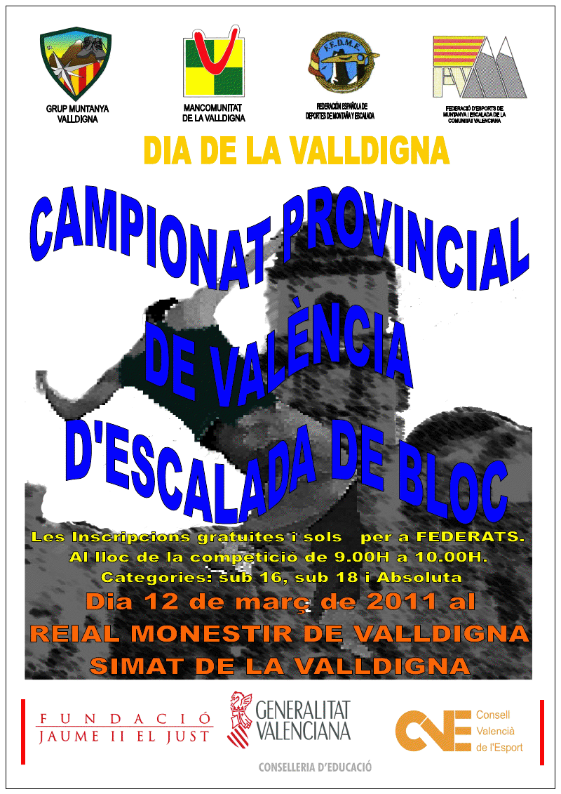 Este any, gràcies a la col•laboració de la Fundació Jaume II el Just, farem la competició de Bloc dins del mateix recinte del Reial Monestir de Santa Maria de Valldigna, cosa que després de 714 anys pot ser siga la primera prova esportiva a nivell territorial que s’ha fet en el recinte monacal, el qual va ser clau en la historia del Regne de València. Abans denominada vall d’Alfandec o Marinyén, La Valldigna va ser habitada durant l’alta edat mitjana per musulmans fins que en els anys 1242-43 la va conquerir el rei Jaume I d’Aragó. El seu nét, Jaume II, en ocasió d’una expedició pel regne àrab de Múrcia i Almeria, a finals del segle XII, enl passar per la vall d’Alfandec o Marinyen, sorprés per la seua bellesa, es va girar cap a l’abat de Santes Creus, que viatjava amb ell, i li va dir: "Vall digna per a un monestir de la vostra religió!" Este va respondre: " Senyor: Vall digna". Des de llavors la vall es denomina Valldigna.
