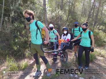 También pudimos ver, por primera vez para la mayoría de nosotros, como funcionaba la silla joëlette para que las personas con discapacidad motriz puedan realizar excursiones por la montaña, situación que se aprovechó desde la vocalía de Montaña inclusiva y Solidaridad de la FEMECV para explicar el funcionamiento de la vocalía y sus objetivos a corto plazo.