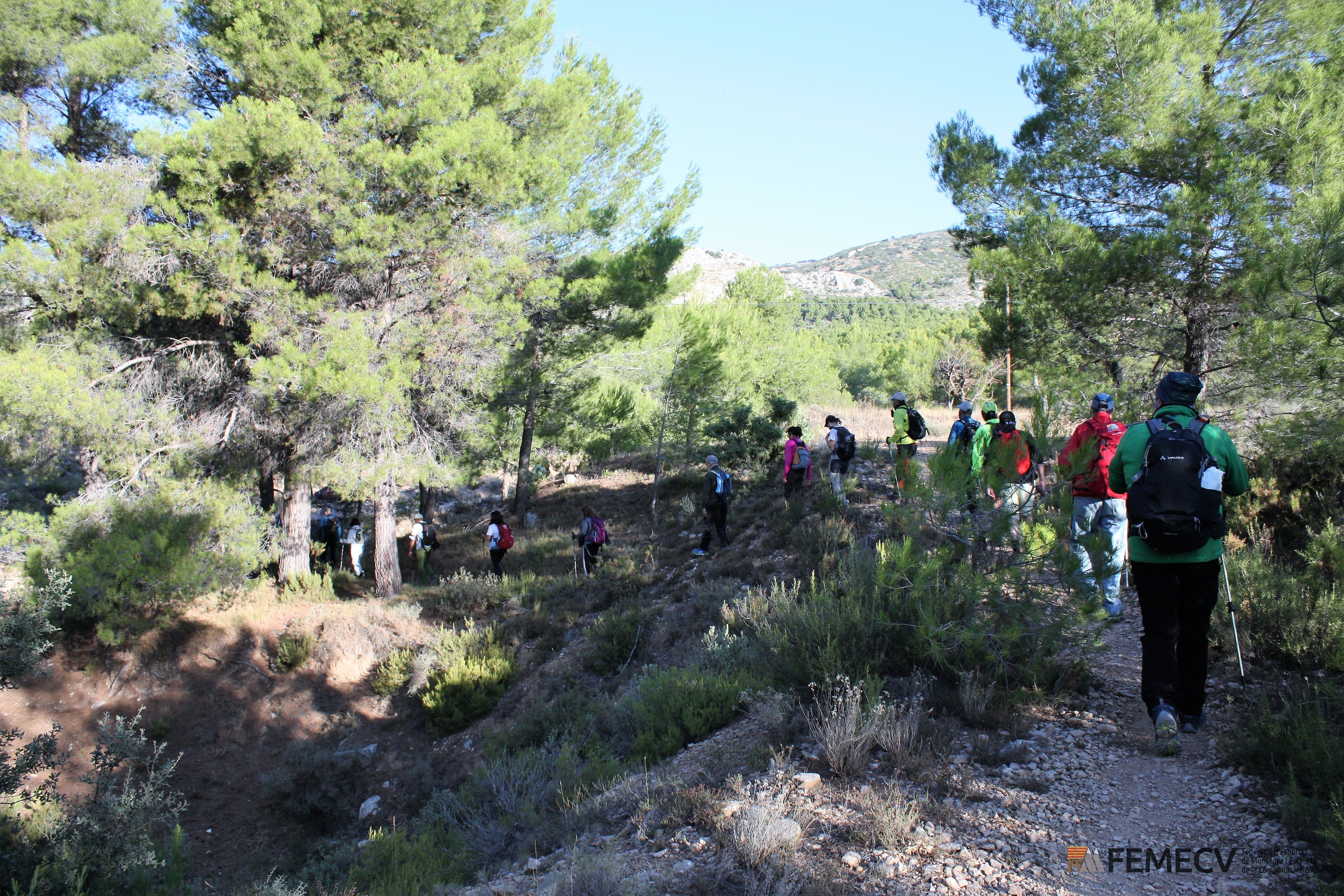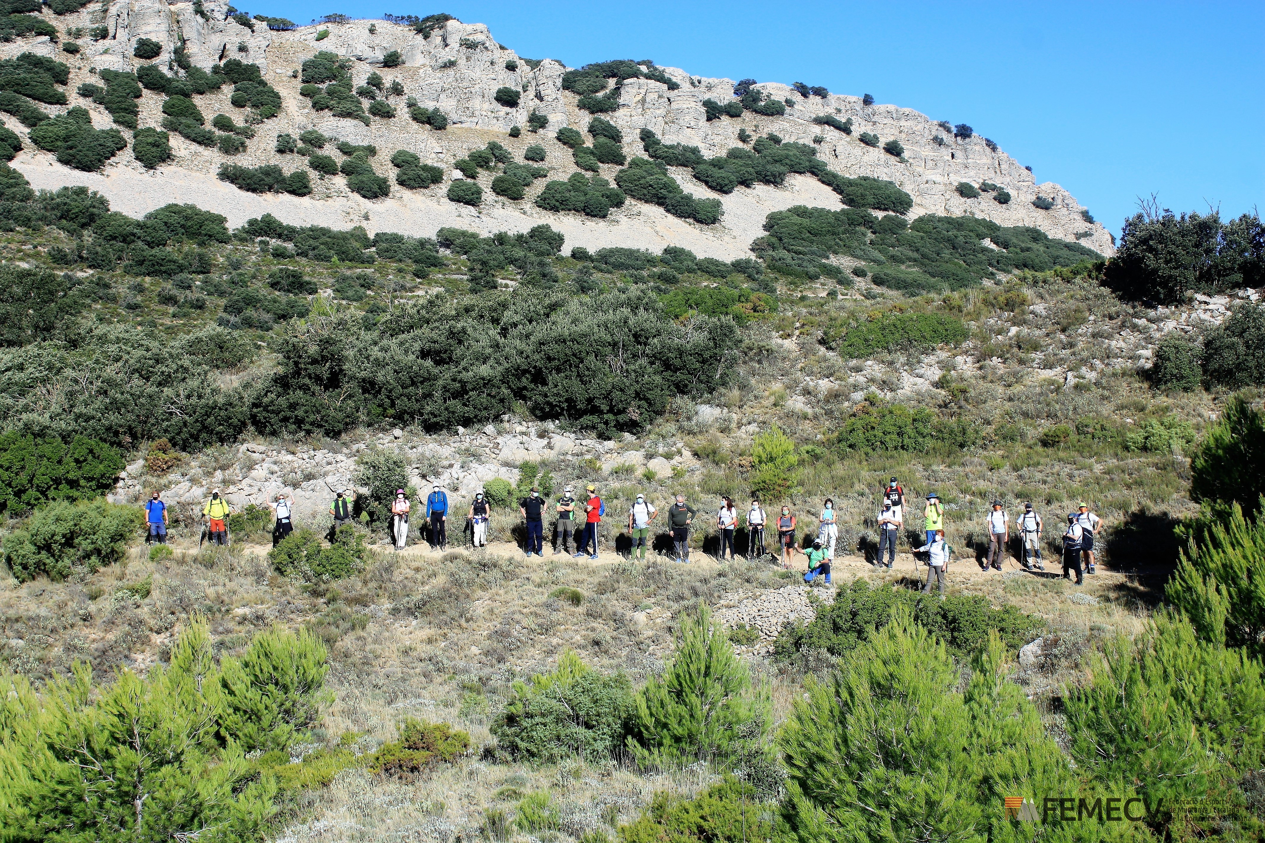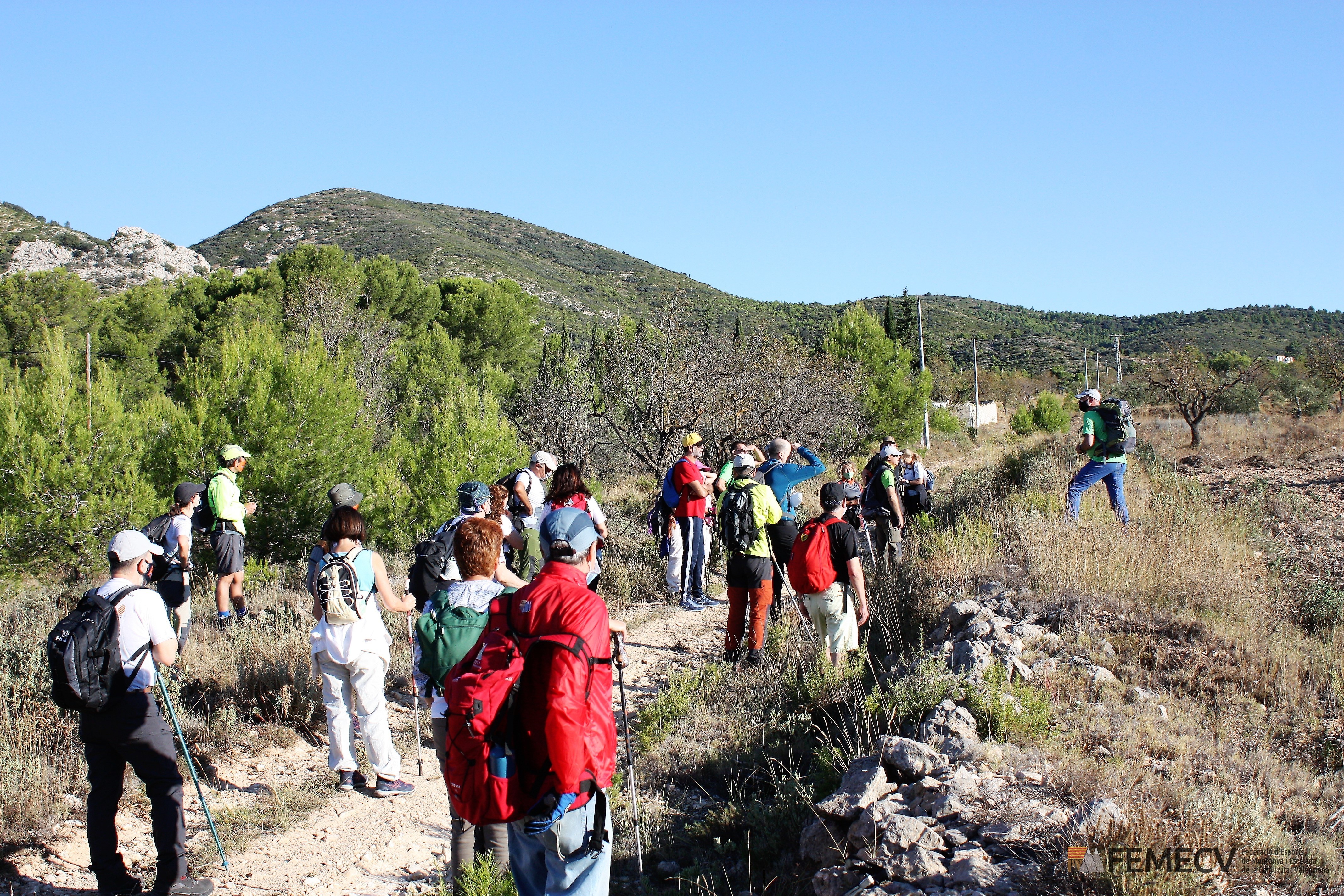 A las 9:00 los participantes iniciaron la ruta con un día soleado, pero ventoso, desde el parque municipal de Torremanzanas siguiendo el GR 330 y el PR- CV 232 en dirección N hasta llegar al paraje de la Canaleta, desviándose en ascenso por el barranco del Rentonar, teniendo de frente la costera de la Mare de Deu y la cima del Els Plans con unas vistas espectaculares: Puig Campana, Cabeço, Aitana y el Mediterráneo,