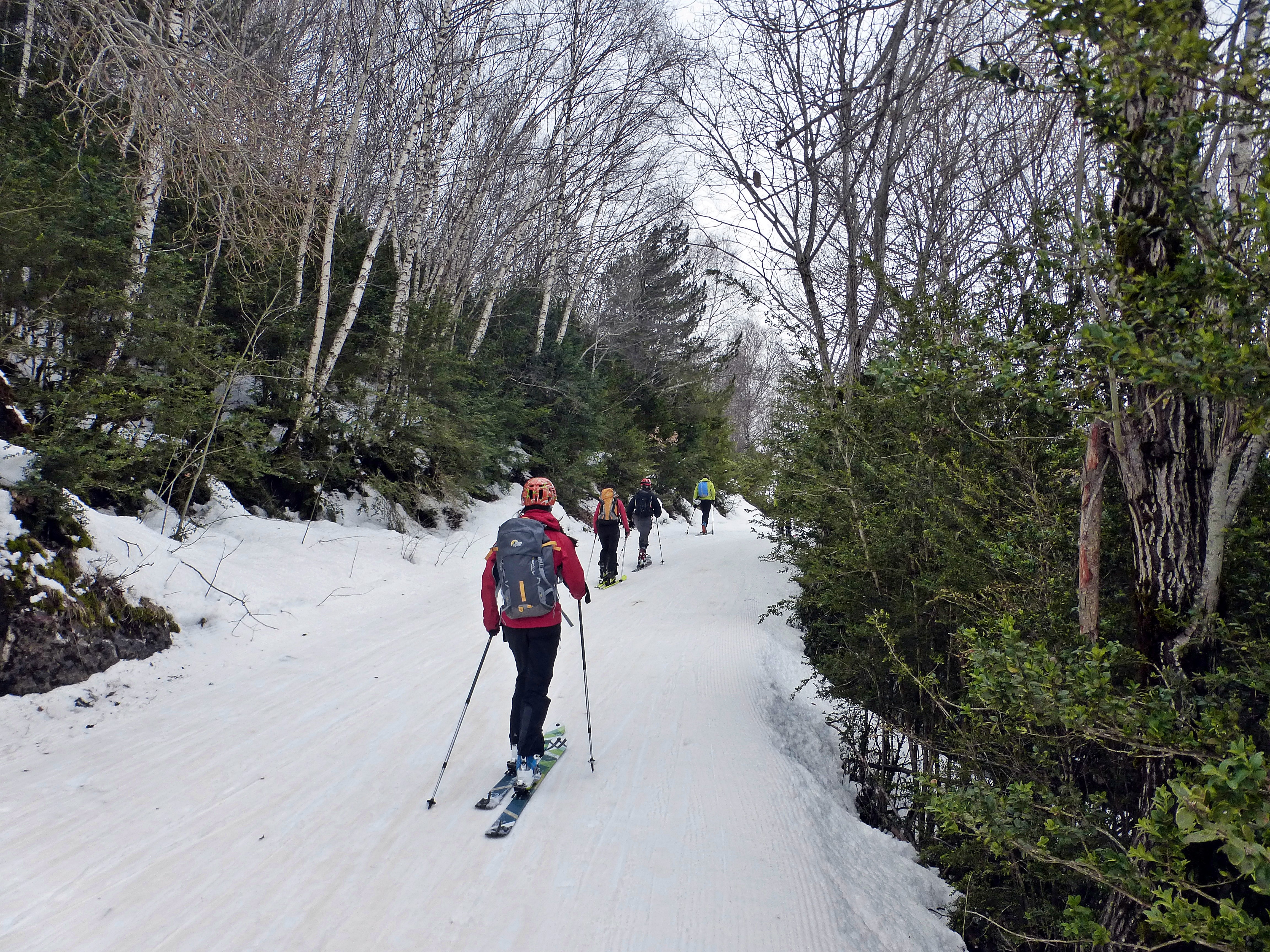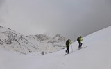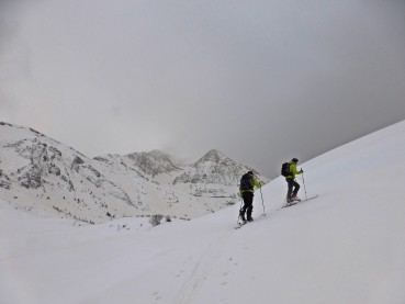 Al día siguiente misma hora de levantarse, desayunar, recoger apartamento y al tajo, en Bielsa el tiempo es bueno pero cuando llegamos a la boca norte el nevadón que estaba cayendo y la falta de visibilidad nos hace replantearnos la situación. Lo bueno de madrugar es que aprovechas mucho más el día y que el margen de maniobra es muy amplio. A las 10 estamos en el valle de Tena, cambio de mochilas, esquís y a sudar un poco. El viento y la niebla nos acompañaron toda una jornada en la que la precaución por el riesgo de alud fue máxima, un manto superior húmedo y muy pesado hizo que fuésemos eligiendo con mucho cuidado por donde ir trazando.