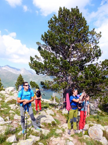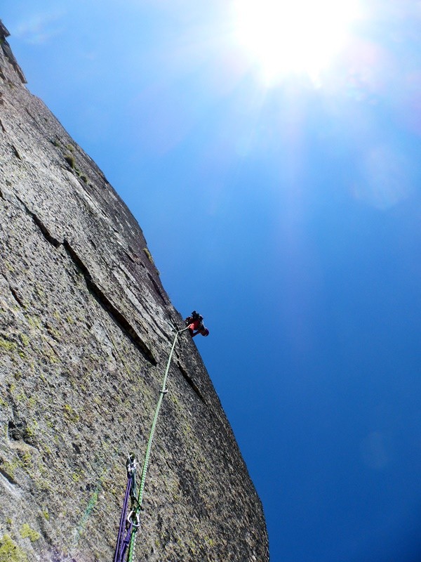 El primer día organizamos todo y aproximamos hasta los ibones debajo de las agujas, tres horas y media de sudada que pudimos refrescar en el ibon donde vivaquearíamos. Al día siguiente organizamos cordadas y nos fuimos a escalar, unos a la “Norte Directa”, ruta de grado asequible pero con compromiso, reuniones a montar y algún clavo opcional para proteger en los largos y reforzar reuniones, por supuesto, optamos no llevarlo, pesan demasiado. La otra cordada eligió una ruta más moderna “Mosquitoexpanding”, 7a+ y 6b obligado que te hace concentrarte hasta en los largos mas “fáciles”.
