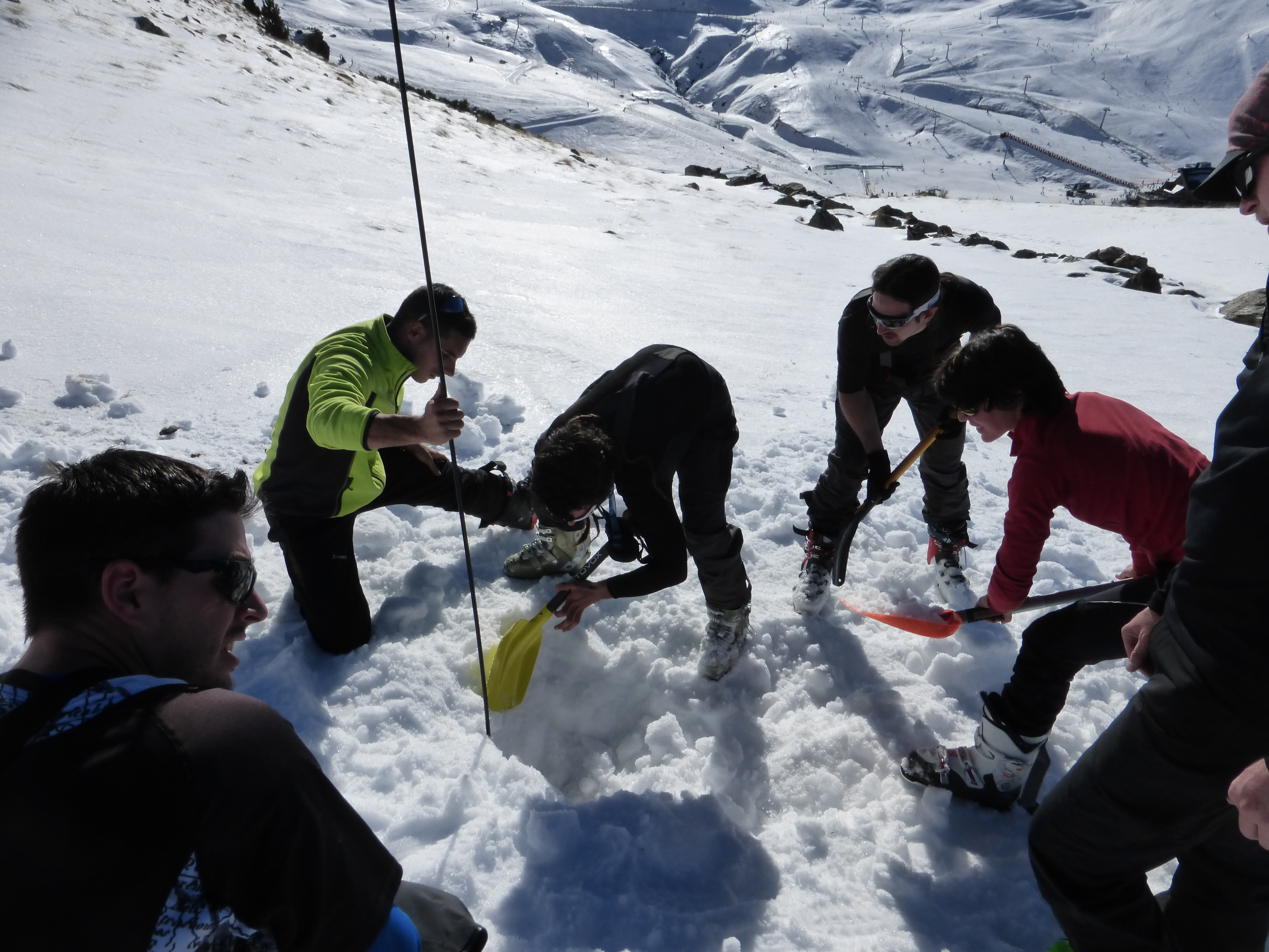 El sábado lo dedicamos a perfeccionar la técnica de descenso aprovechando las instalaciones de la estación y al finalizar el horario de la estación hicimos una práctica de búsqueda de victimas de avalancha con el DVA, la pala y la sonda, sondaje, paleo estratégico y todas las nociones básicas del protocolo de búsqueda.