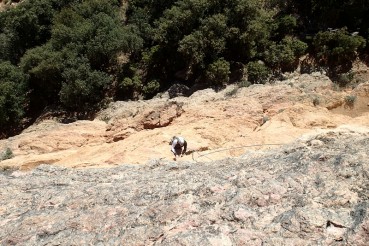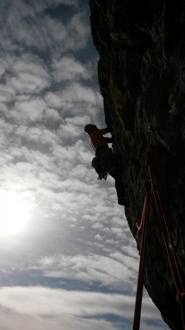 El primer día organizamos tres cordadas y se escalan las vías, Wild Planet, Musical Expres y El Baron Rampante. Wild Planet es una vía que recorre el centro de la pared, de las más largas y prácticamente entera de autoprotección, elegante y con largos muy bonitos. Musical Expres es la gran clásica equipada de la pared, posiblemente la más repetida. El Barón Rampante es la más dura de grado entre las elegidas, 7a+ con un grado obligado de 6b, escalada monolítica con duros pasos de bloque.
