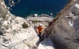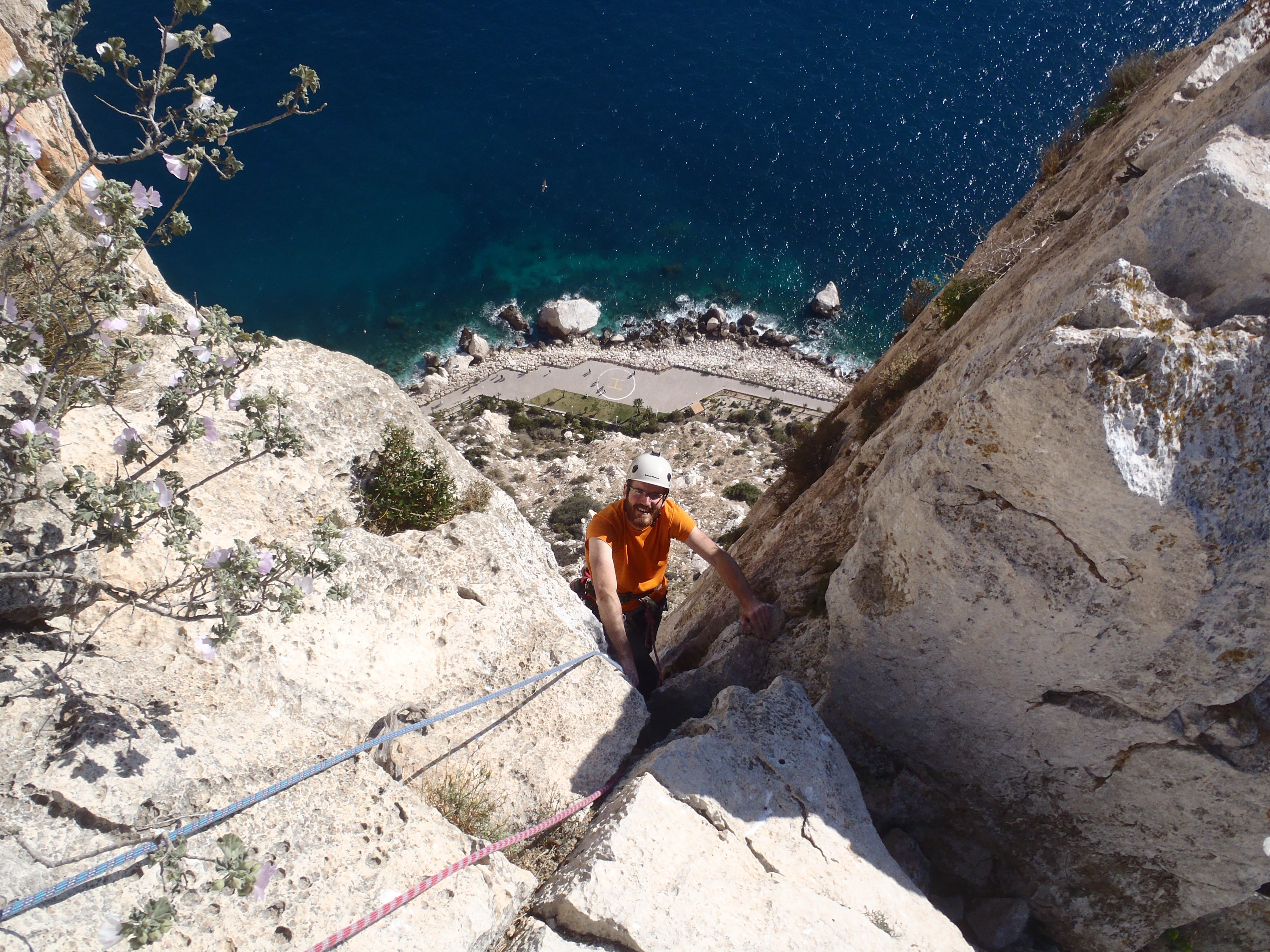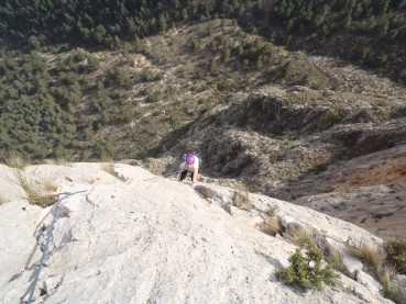 Un día perfecto, buena temperatura y nubes que tapan el sol. A mitad de vía nos pilla una pequeña lluvia que los que estábamos en Café Licor esquivamos en los desplomes de la ruta y esperamos medianamente protegidos a que pase. Tranquilamente escalamos los últimos largos, que no desmerecen nada de los anteriores pero están separados por amplias repisas, lo que hace que mucha gente se baje sin escalarlos, perdiéndose uno de los mejores largos del Ponoig en su grado. Descendemos por la línea de rapeles y lo celebramos en Polop.