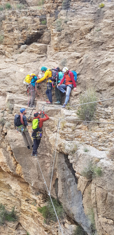 Para el domingo, y visto que las previsiones de meteo permitirían hacer una vía ferrata, se decidió ir a la vía ferrata de Callosa, donde el alumnado pudo poner en práctica real todo lo aprendido el día anterior. Pudieron darse cuenta que la presión ante la situación de llevar clientes a su cargo hace que se cometan fallos, pero a la vez, hace estar muy concentrados en la progresión de las personas al cargo. Se realizaron comentarios constructivos para mejorar la conducción de clientes, viendo el posicionamiento del guía y la recepción de clientes, cruces de puentes, diferentes técnicas de aseguramiento y un largo etcétera.