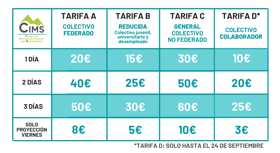 Se establecen varios tipos de tarifas, atendiendo a distintas categorías y precios, con las que se pretende abrir a todos los públicos esta oportunidad que por primera vez en la Comunidad Valenciana reunirá a más de 35 participantes en ponencias, mesas redondas, talleres, exposiciones y comunicaciones alrededor del montañismo.