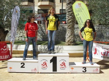 Melisa Galí, que també portava una marató de fa una setmana, ha eixit forta com sempre. Meli està en un moment de forma excepcional i pot donar moltes alegries esta temporada. Lola Peñarrocha (GR33 Tottrail) ha intentat seguir-la, finalment segona. Silvia Miralles (Mur i Castell Tuga) tercera, no ha pogut revalidar el títol de 2013, pero pot estar contenta de la temporada. Per darrere dura lluita entre Raquel Martínez (Mur i Castell Tuga) i Míryam Talens (Marathon Crevillent) en els darrers quilòmetres.