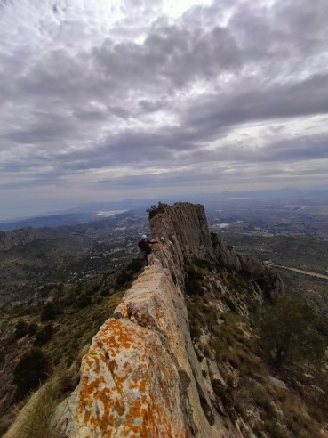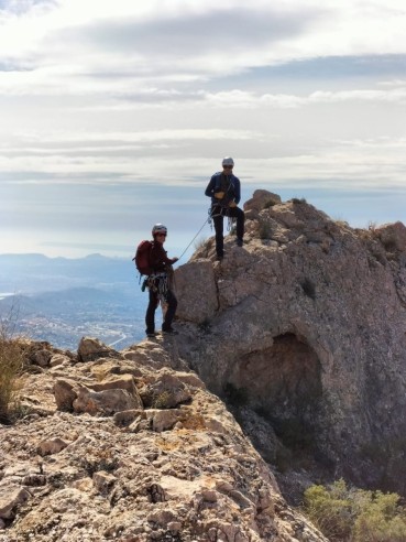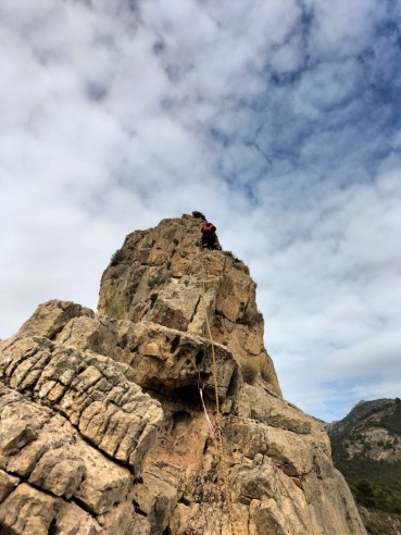 El domingo la formación se trasladó a Busot. A primera hora, en las mesas de pic-nic de Les Coves del Canelobre, se repasó todo el contenido del día anterior para pasar después a la pequeña cresta que hay al inicio de la Cresta de les Coves. Se practicaron las técnicas de progresión (excepto la de largos que la vimos en La Foradà) y se ascendió.
