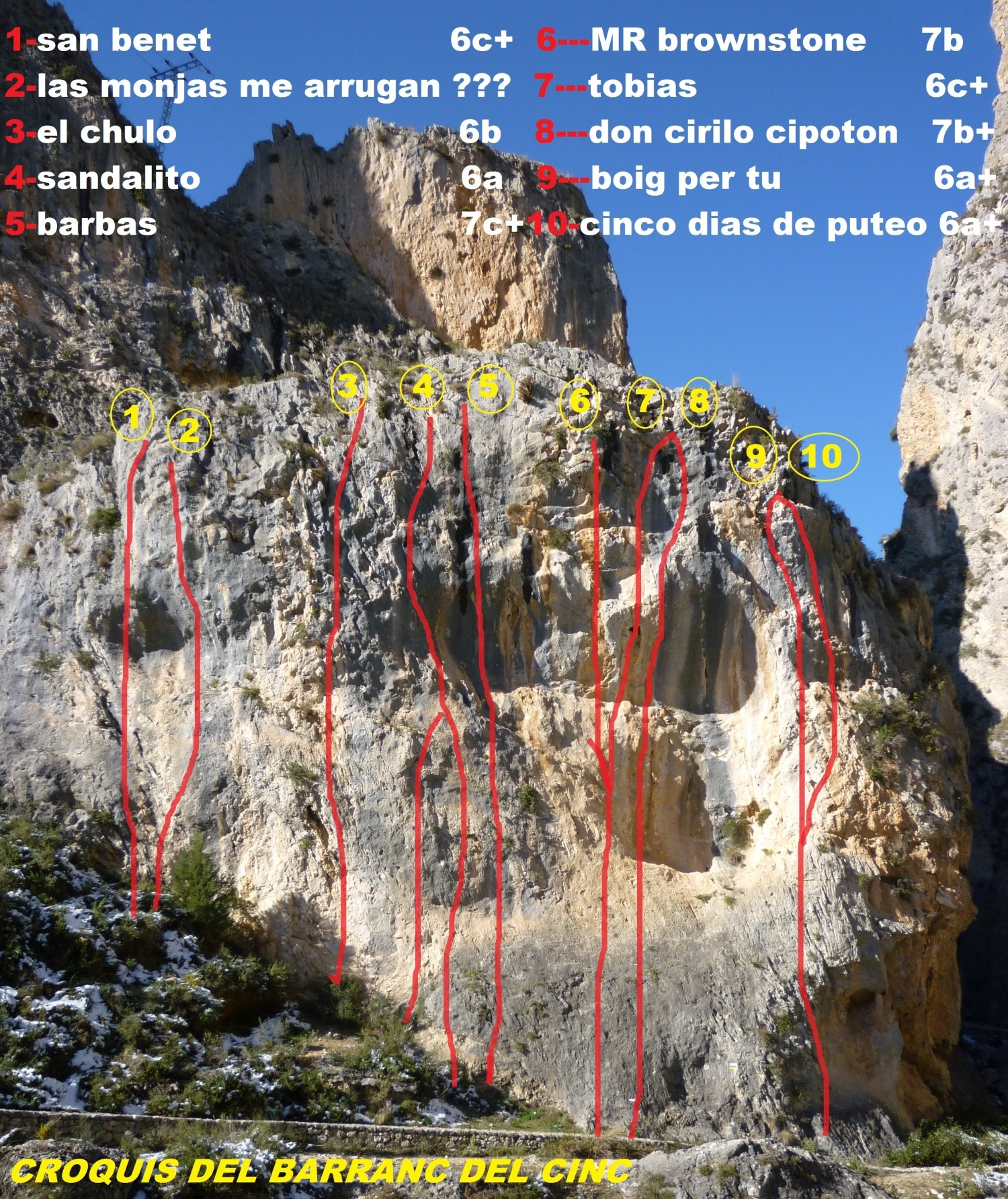 Se trata de más de una docena de vías. Estas vías están totalmente equipadas con parabolts, y los descuelgues y rápeles con cadenas. Para nuestro disfrute.