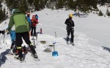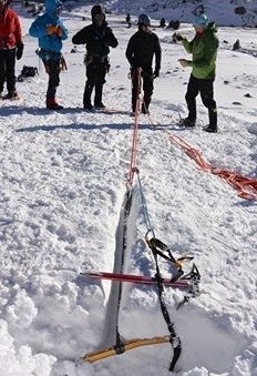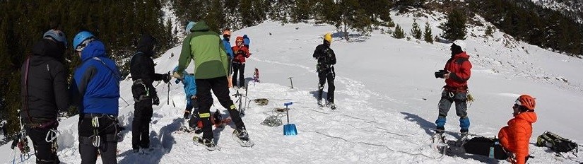 En una buena pala de nieve se han podido trabajar los anclajes en nieve con piolets, palos, raquetas, etc.. además de hacer los anclajes con piolet recuperable. Por último, hemos hecho un aseguramiento con trono y al cuerpo. Y ya para poner la guinda final, se ha filmado un simulacro de rescate.