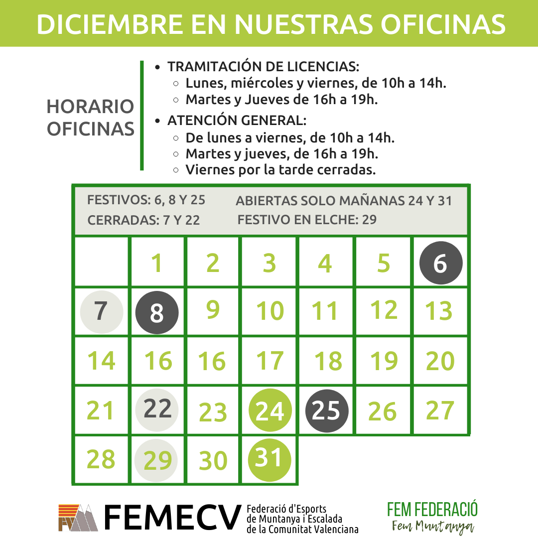 Los días, 8 (Día de la Inmaculada ) y 25 (Navidad), nuestras oficinas permanecerán cerradas, al tratarse de festivos nacionales. Los días 4 y 31, vísperas de festivos, la atención al público se realizará en el horario de mañana.