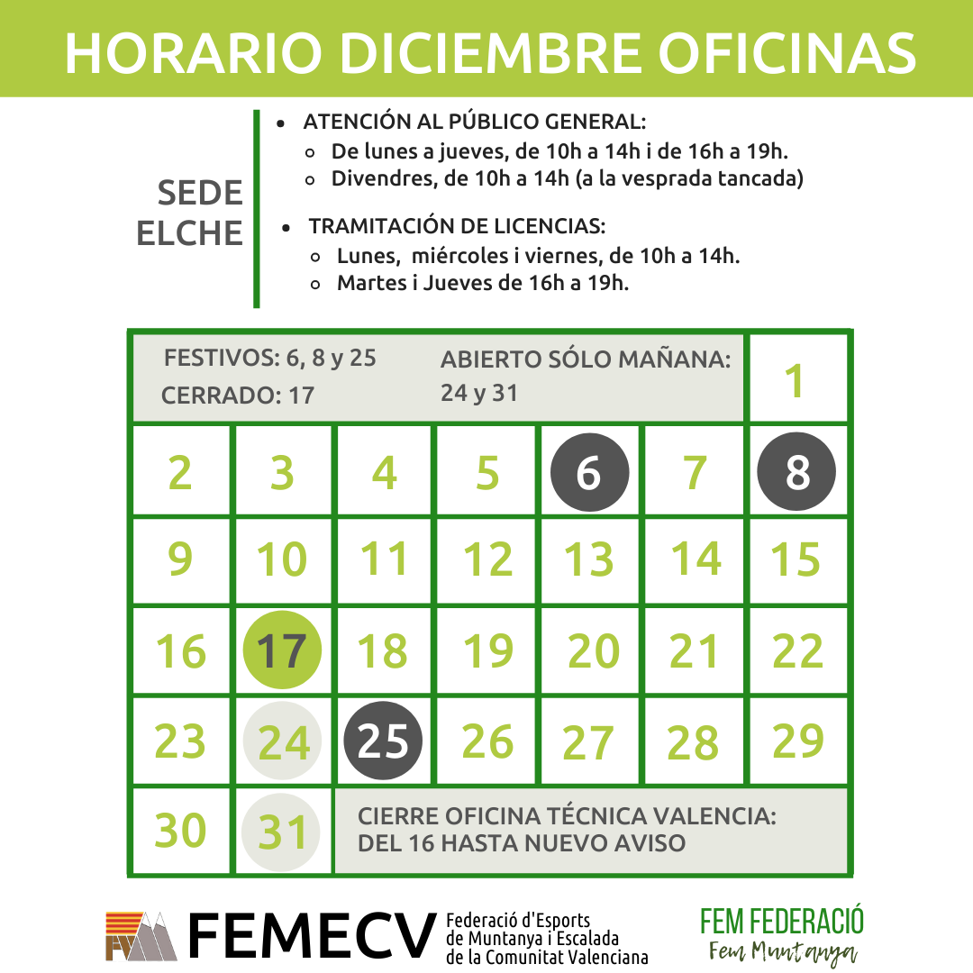 Los festivos y días en los que cerrará la Sede de Elche: viernes 6 (Día de la Constitución), martes 17 (Jornada de formación), martes 24 por la mañana, miércoles 25 (Navidad) y el 31 por la tarde (Nochevieja). La oficina Técnica de Valencia cerrará: viernes 6 (Día de la Constitución), y del lunes 16 hasta nuevo aviso (traslado nueva ubicación).