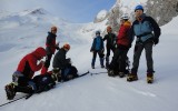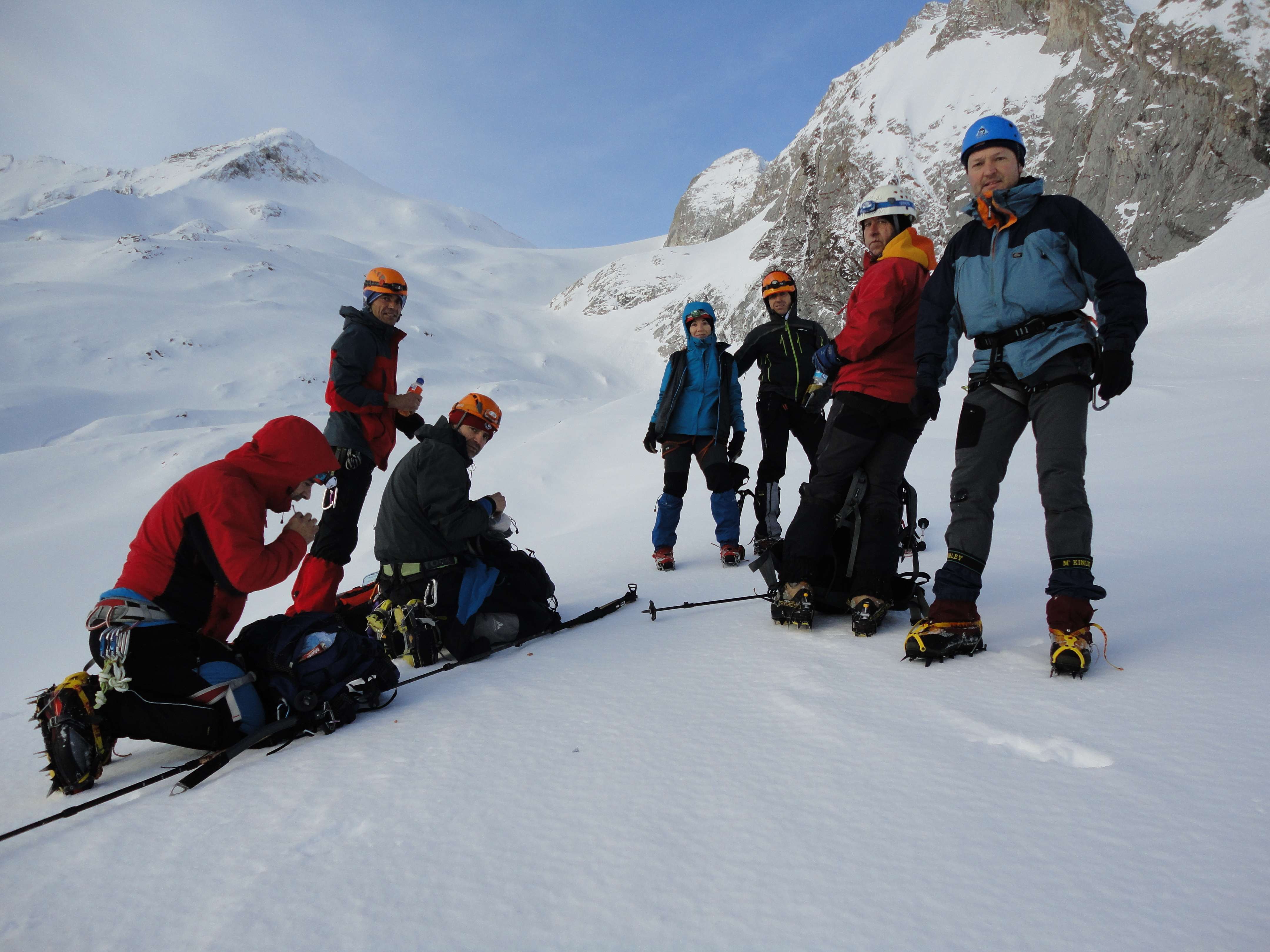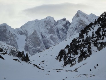 El primer día partieron de la parte baja del valle de Gaude, ascendiendo por un sendero ya con nieve desde el inicio, que iba ganando altura y nos adentró en el circo del Vignemale. Fué una aproximación entretenida, con el río a la derecha, donde pudieron observar varios saltos de agua pintorescos. La jornada finalizó en el refugio de Oulettes, a 2.151 m. Éste refugio está situado en un enclave majestuoso, desde donde se contempla la cara norte del Vignemale, con paredes verticales de hasta 800 m. de caída, donde se encuentran incrustados bloques grandes de hielo fragmentado por importantes grietas llamados comúnmente Seracs , siendo estos los más espectaculares del Pirineo.