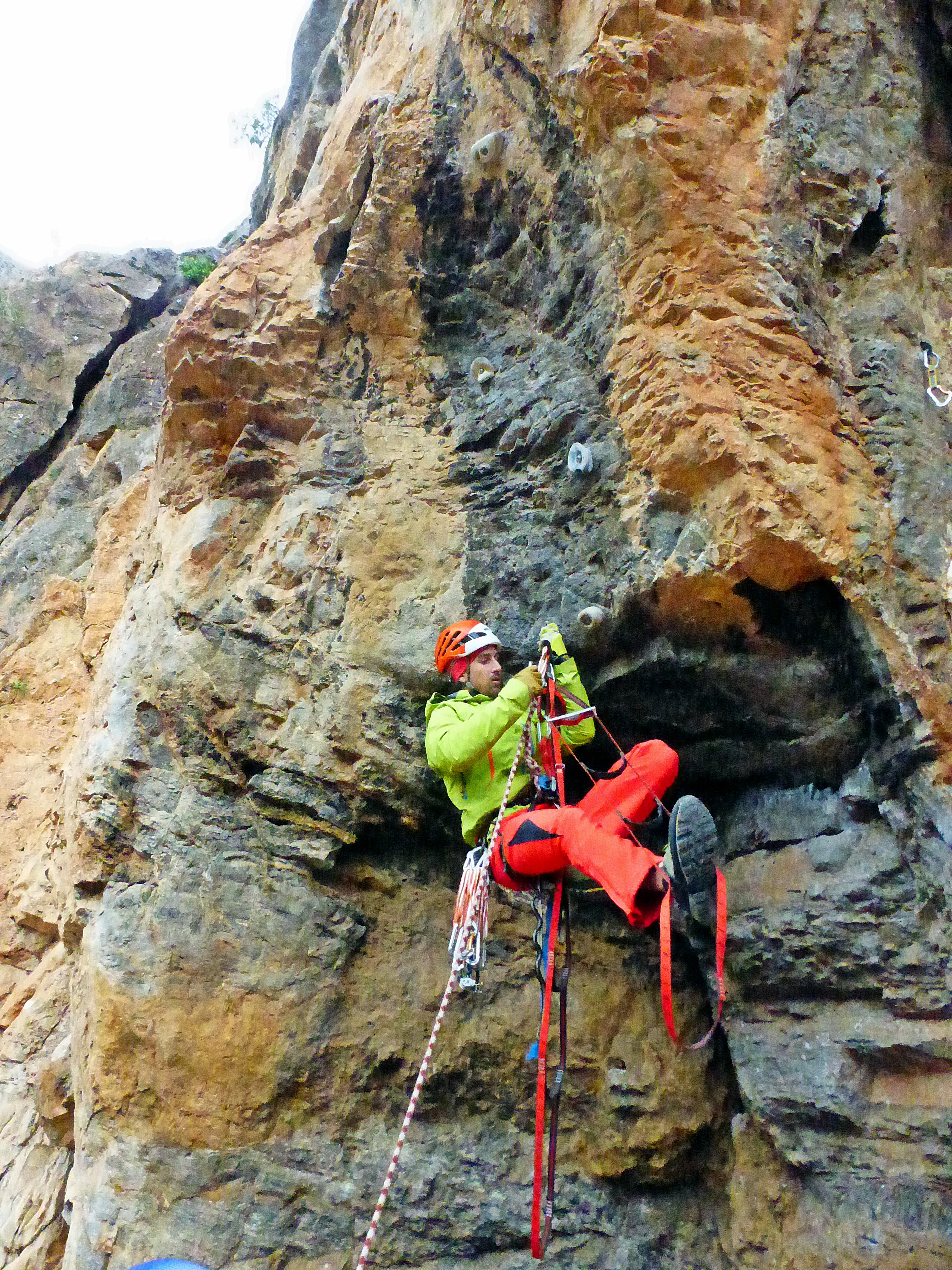 El sábado quedamos en la zona de Redován, la única zona donde no daban lluvias. Empezamos recordando las técnicas de progresión con estribos. Después empezamos a ver los seguros flotantes de progresión que se utilizan en escaldadas de artificial duras, micro clavos, plomos, mircro empotradores, etc. Vimos como probar y hacer más segura la progresión sobe estos tipos de seguros. Nos pasamos el día haciendo prácticas de estos temas.