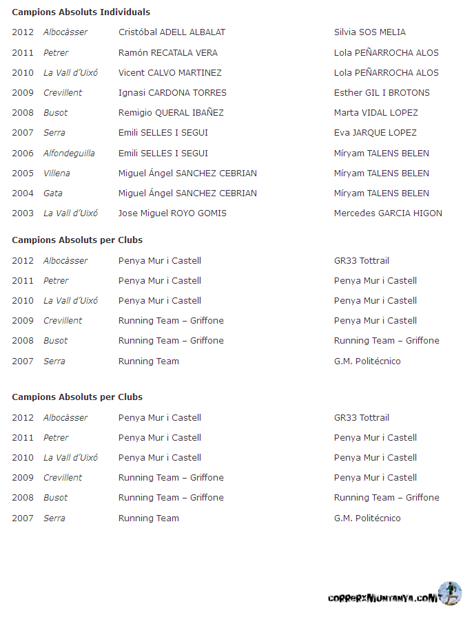 A todos estos corredores de élite se suman otros aspirantes invitados para la ocasión, Granadero, Gil, Duplas, Adrián, Galí, García Bardoll, Quilis, etc. Todos ellos con nivel suficiente para ocupar cualquier peldaño del podio. En la competición por clubes el Mur i Castell - Tuga defenderá sus tres títulos consecutivos en categoría masculina frente al Marathon Crevillent, que ha empezado la temporada golpeando fuerte (Campeón de Liga). Mientras que el título femenino lo defenderá el GR33 Tottrail de Castelló, frente al tambien fuerte Mur i Castell - Tuga de La Vall d'Uixó.