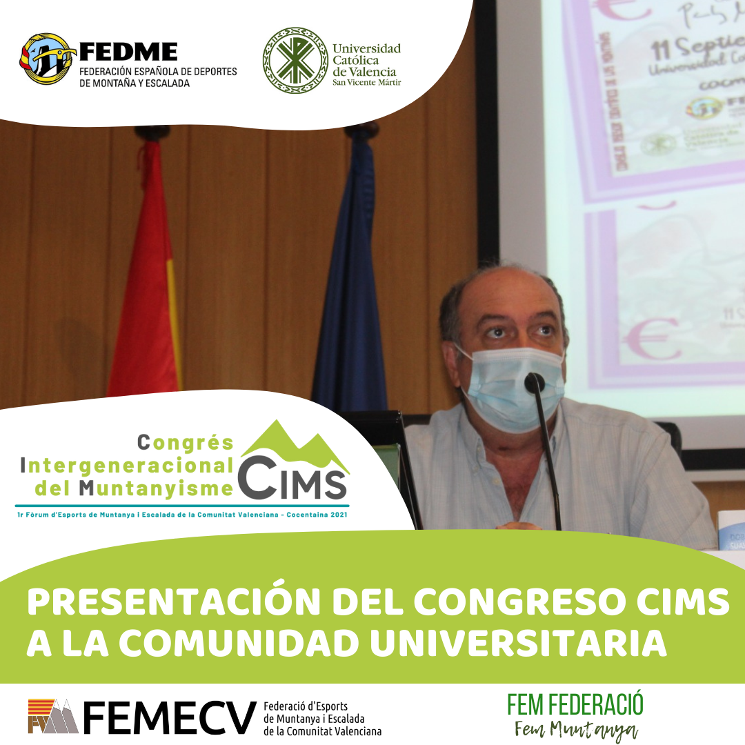 Carlos Ferrís, presidente de FEMECV, presentó el pasado viernes, 10 de septiembre, el I Congreso Intergeneracional de las Montañas (CIMS) a la comunidad universitaria. El marco elegido para ello fue la primera de las Jornadas Sendecovid, organizadas por el grupo de investigación en Deportes de Montaña, Ocio y Tiempo Libre de la Universidad Católica de Valencia (UCV) y pensadas para analizar la actualidad y tendencias en senderismo durante la pandemia.