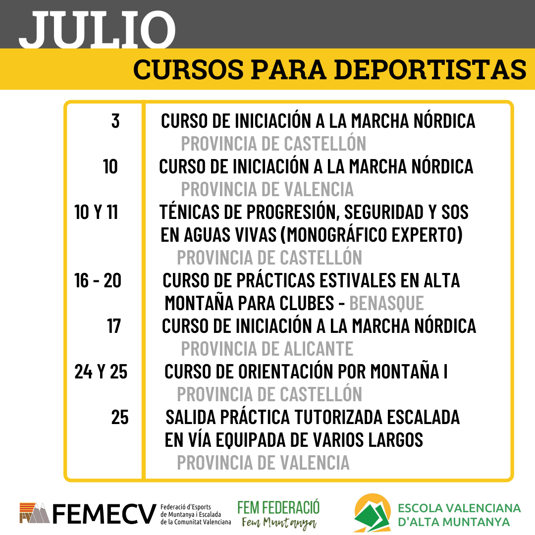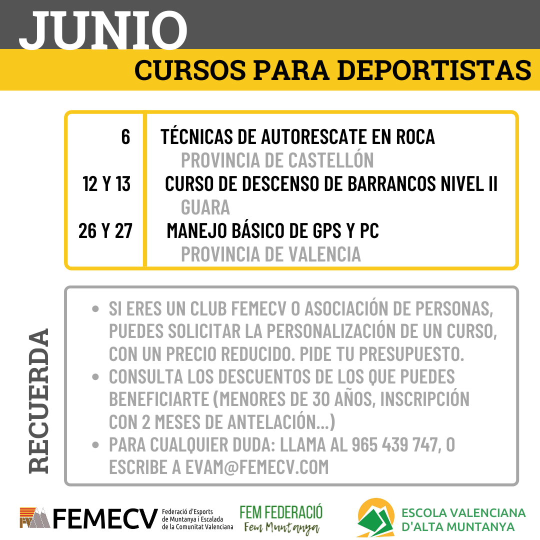 Con más de 30 acciones repartidas entre las 3 provincias de la Comunidad Valenciana e impartidos por técnicos deportivos en activo o expertos reconocidos en su materia, estos son algunos de los cursos que se podrán realizar, de los nueve cursos que se ofertan para los próximos meses.