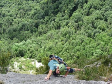 Tres largos decían… Nuestra primera aventura de largos fueron finalmente siete. Es una modalidad muy exigente, en la que hace falta mucha resistencia tanto física como psíquica. Y eso lo comprobamos Alba y yo… recogiendo la cuerda largo tras largo, haciendo vías con alejes de hasta 10 m entre chapa y chapa, porque era muy fácil subir, claro. Ten suerte de que no se te resbale un pié… En fin, tiene su encanto, tanto, que me apunté al día siguiente para realizar una ruta más difícil. El proyecto era una vía de 5 largos, con una dificultad de hasta 6c+ en placas francesas…