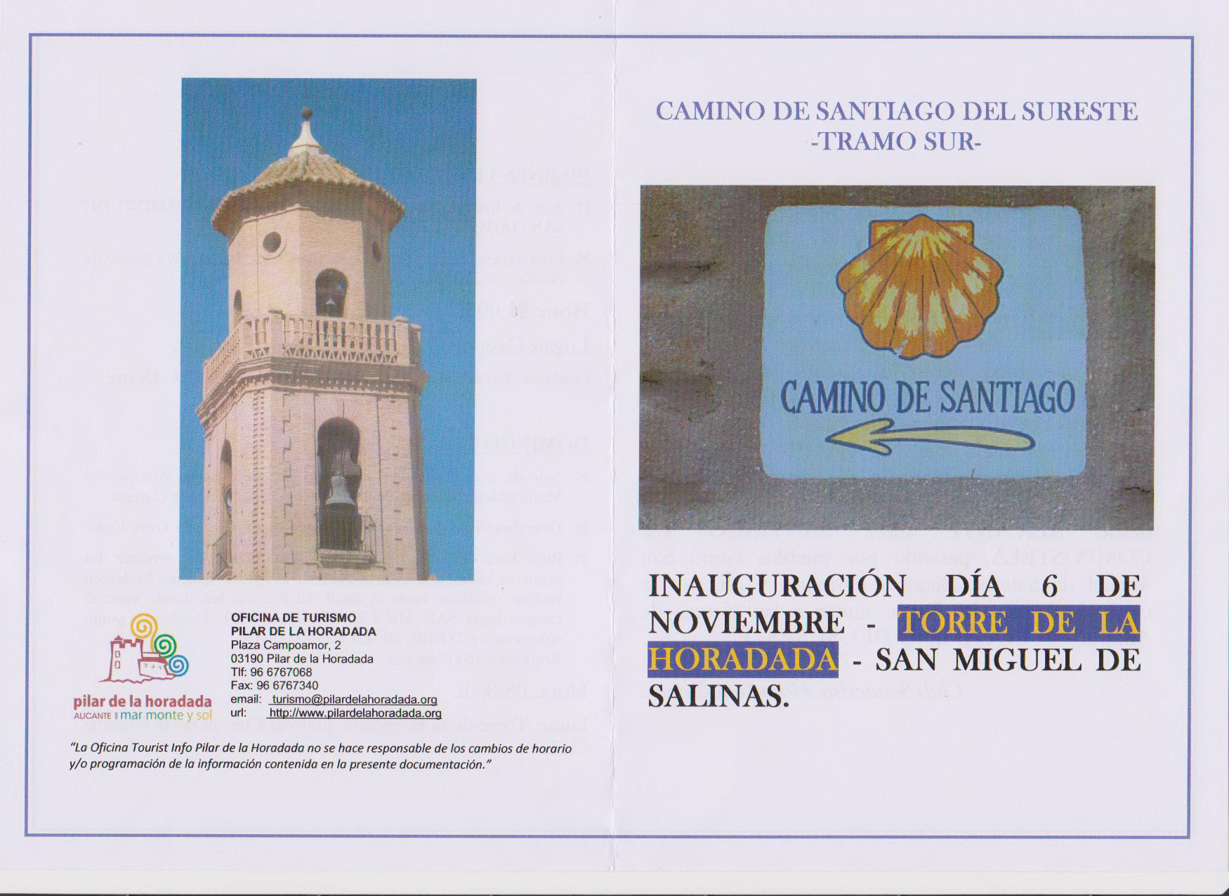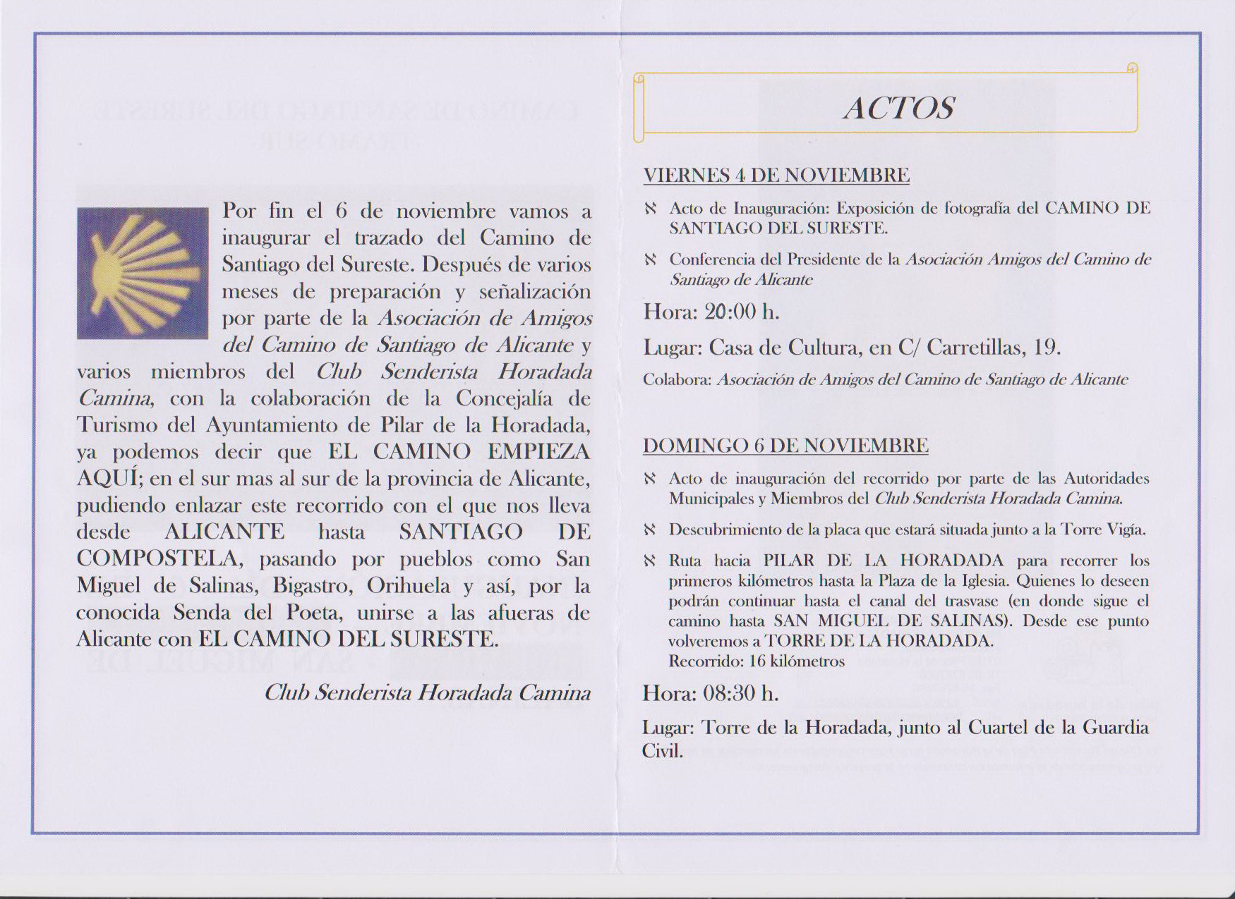 Serán dos actos diferentes , el día 4 de noviembre en la casa de cultura a las 8 de la tarde ,exposicion de fotografia del camino de santiago y charla sobre el mismo, y el día 6 de noviembre haremos el recorrido de inicio desde torre de la horadada para recorrer el paseo maritimo, en direccion a la playa de las higuericas y subir por la canalización de la rambla hasta la plaza de la iglesia de pilar de la horadada.