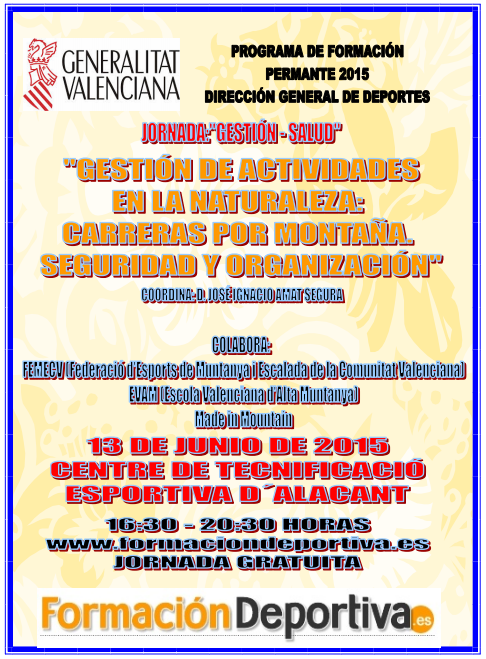 Este sábado 13 de Junio se celebran las Jornadas de seguridad en carreras por montaña en el Centro de Tecnificación de Alicante. Van dirigida a corredores y organizadores, así como deportistas de montaña en general. SON GRATUITAS, y los que no hayan podido  inscribirse online podrán hacerlo directamente a la entrada de la sala de conferencias.