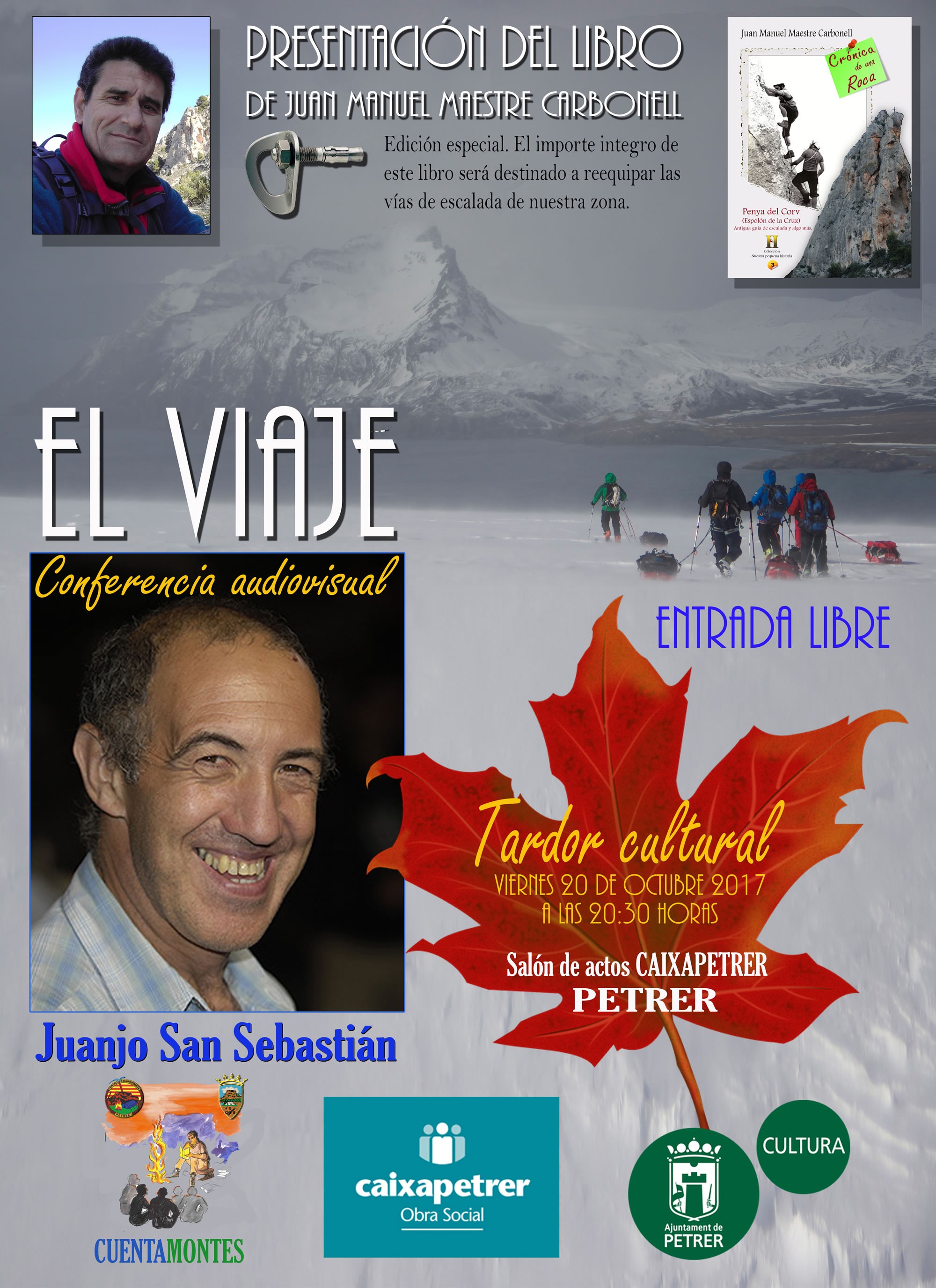 Previo a esta proyección, se presentará el tercer libro de la colección “Nuestra pequeña historia” del Grupo Cuentamontes. Bajo el título “Crónica de una roca”, su autor Juan Manuel Maestre Carbonell, recoge los acontecimientos de los primeros años de la escalada en nuestro Valle, situándolo en un paraje muy cercano como es la Penya del Corv (Espolón de la Cruz), ubicado en la cercana Serra del Cavall (Sierra del Caballo). La recaudación íntegra de este ejemplar ha sido donada al grupo de escaladores que altruistamente vienen realizando una encomiable tarea en la re-equipación de las vías de escalada de nuestro entorno.