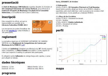 Este sábado 26 de octubre se pondrá fin a la temporada 2013 de carreras por montaña en la Comunitat Valenciana en cuanto a competiciones oficiales. La FEMECV organiza, junto al Club de Muntanya CXM València, la tercera edición del Campeonato Autonómico de Carrera Vertical en la localidad de Serra, en pleno corazón de la Sierra Calderona.