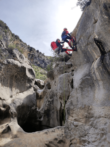 El viernes, la jornada empezó con maniobras técnicas como rapeles fraccionados, desviadores recuperables y colocación de protectores de cuerda. También se realizó una introducción al montaje de pasamanos y la gestión de éstos, y se practicó el ascenso por cuerda con métodos de fortuna.