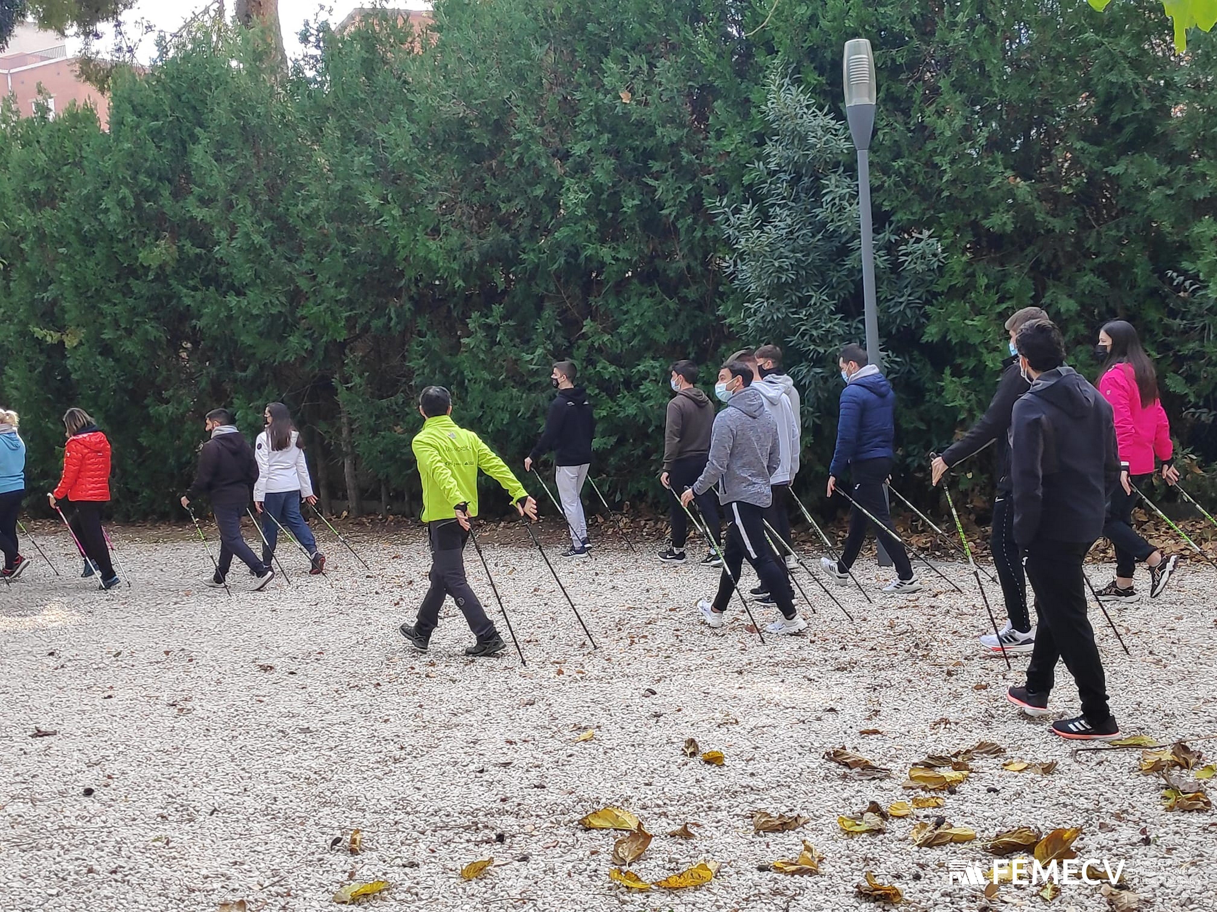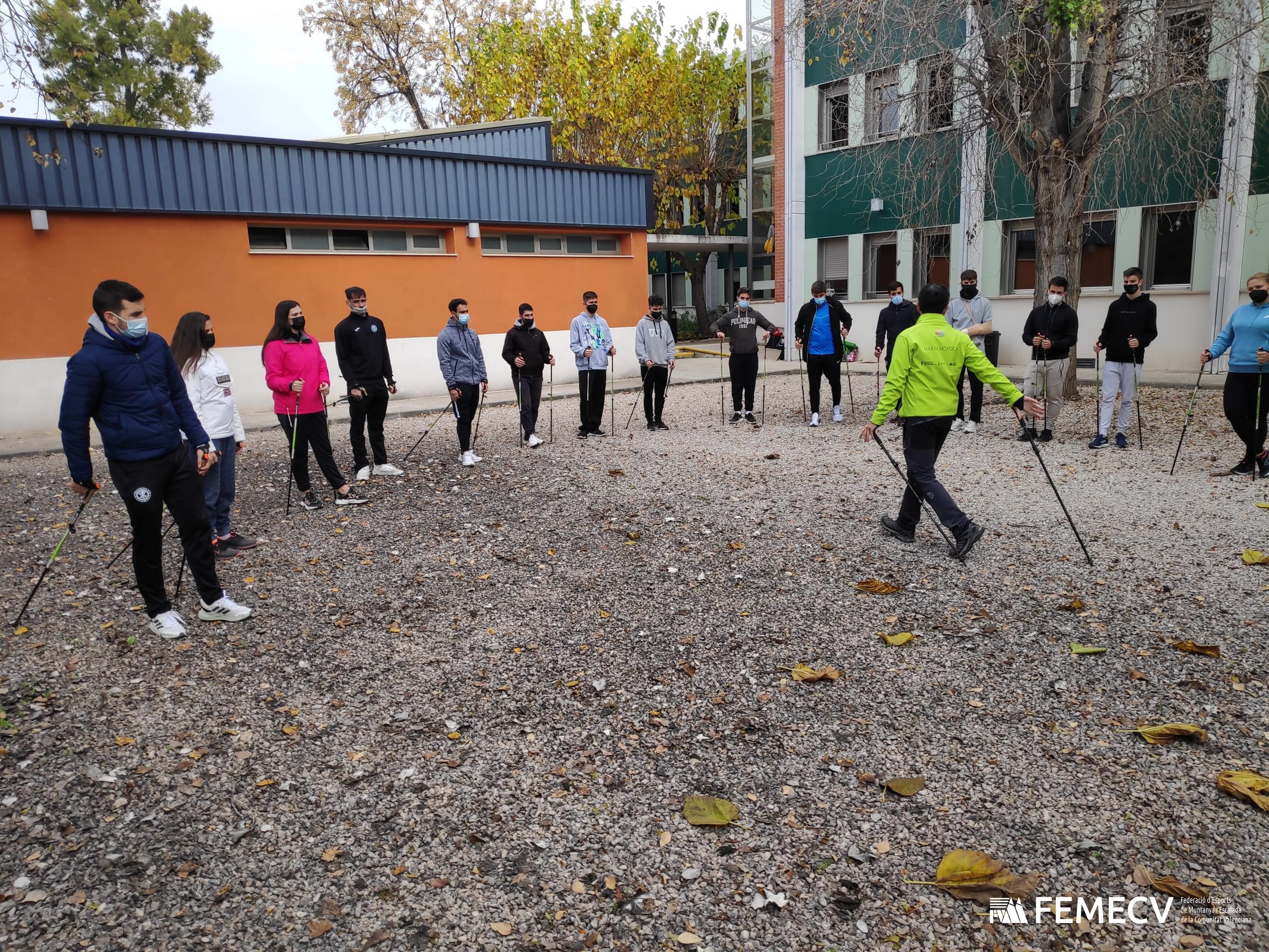 Al terminar la charla, hubo una breve práctica para acercar al alumnado a esta modalidad deportiva. Para ello, contaron con la colaboración de Javier Espinosa como técnico deportivo de marcha nórdica y responsable de área turismo y montaña de dicho comité.