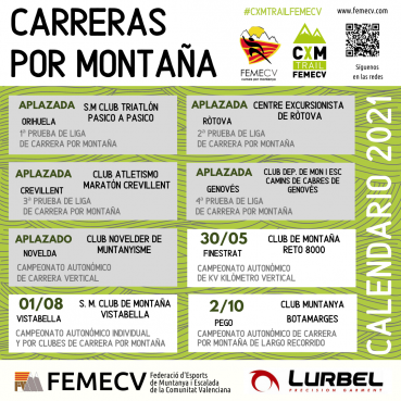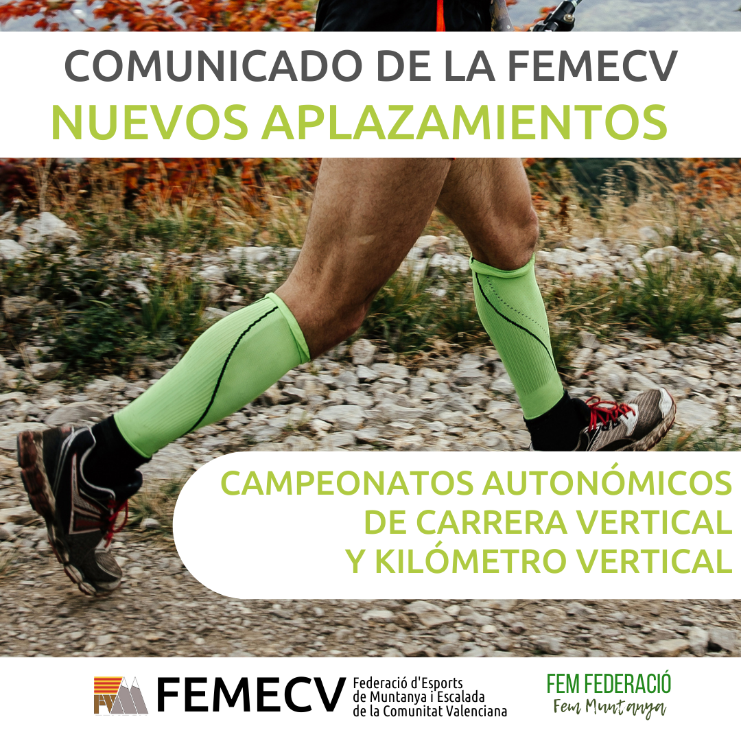 Después de hacerlo con la totalidad de las pruebas de la Liga de Carreras por Montaña, debido al agravamiento actual de la situación sanitaria en la Comunidad Valenciana lamentamos comunicar el aplazamiento del Ct. de Carrera Vertical de la FEMECV que se debía celebrar en Novelda el 13 de marzo.