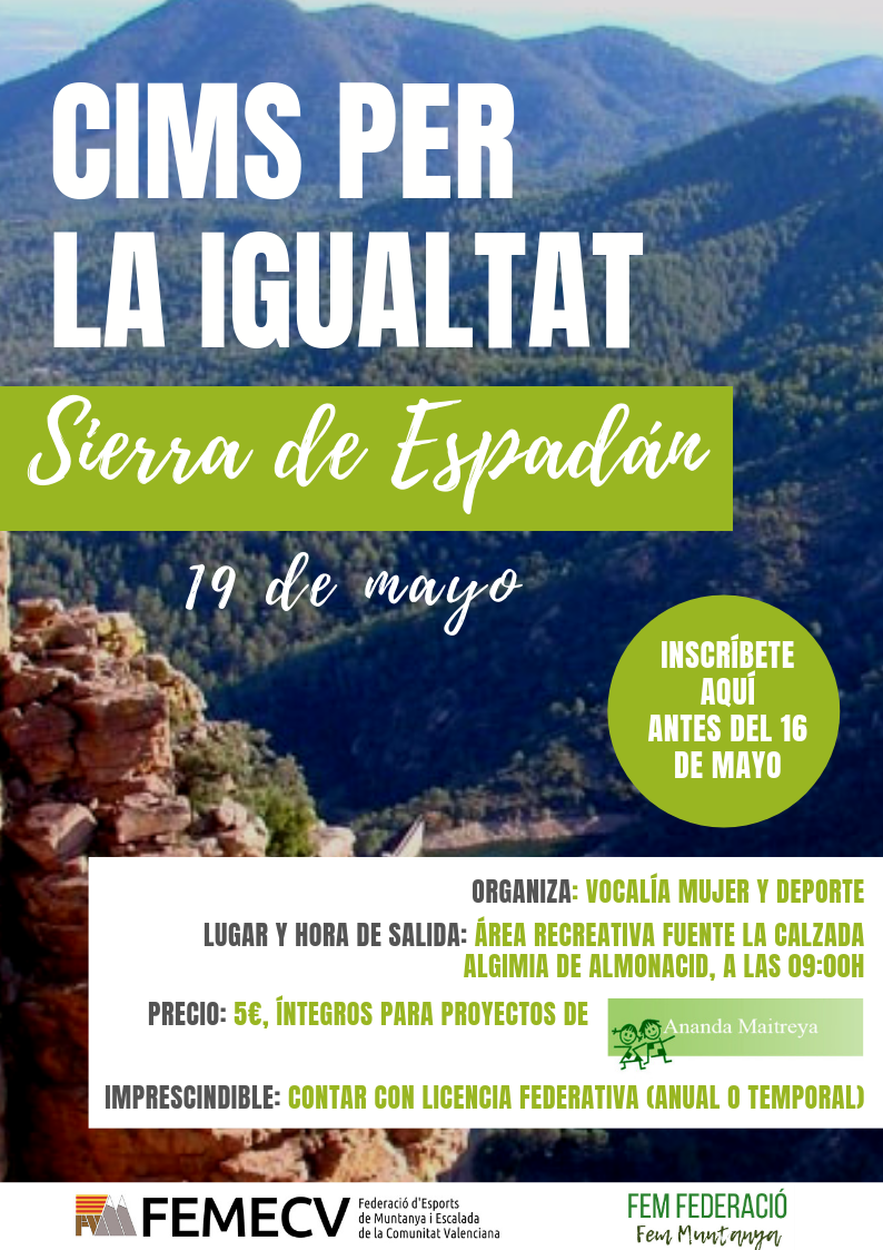 Tras la edición realizada como motivo de la celebración del día de la Mujer, subiendo al Benicadell, la vocalía de Mujer y Deporte, ha organizado una ruta por la Sierra de Espadán: Pico Espadán, por el Barranco Malo y el Barranco del Agua Negra.