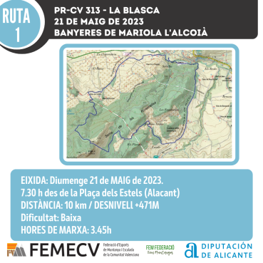 Se recorrerán 10 km con un desnivel de +471m, siendo de dificultad baja y con una duración de unas 3 horas y 45 minutos, saliendo a las 07:30h de la Plaza de los Luceros (Alicante) con autobús.