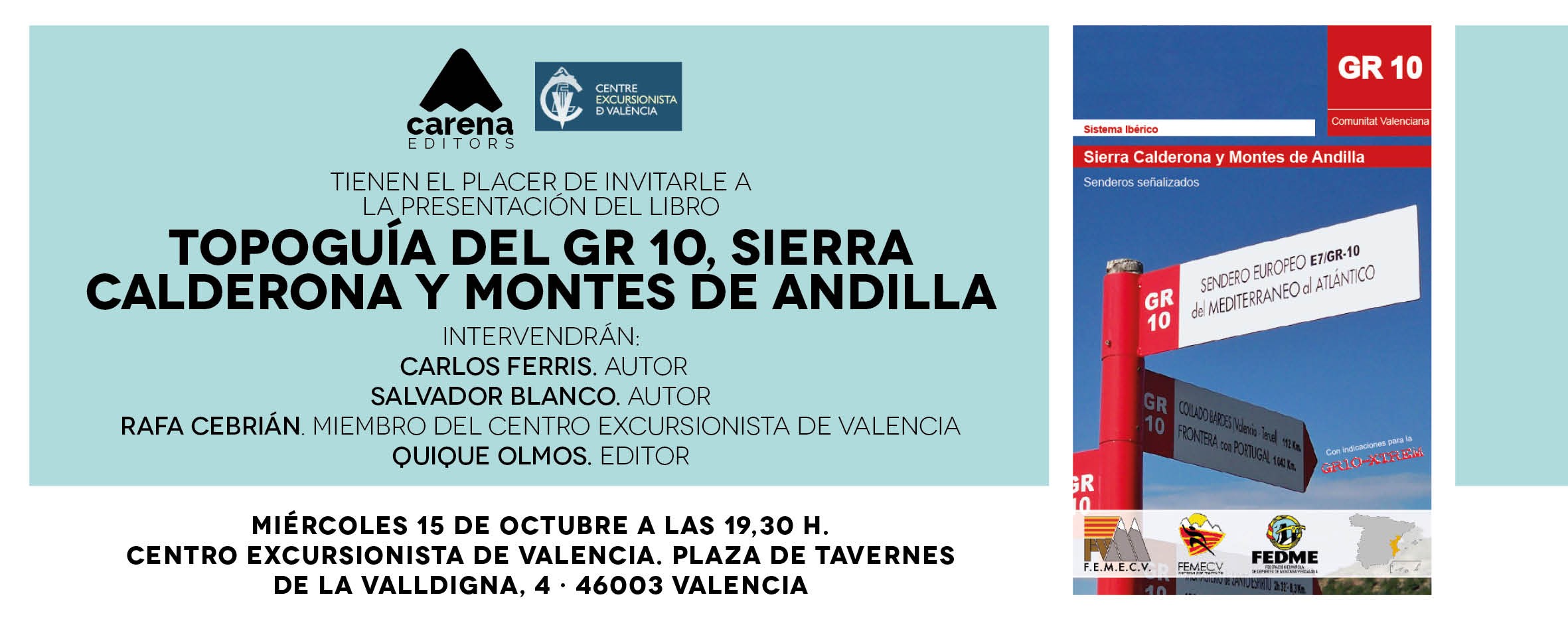 Editada por Carena Editors, la presentación de la nueva “Topoguía del GR 10. Sierra Calderona y Montes de Andilla” tendrá lugar el próximo 15 de octubre, a las 19:30h, en la sede del Centro Excursionista de Valencia. La presentación será a cargo de Rafael Cebrián, miembro del CEV y en el acto intervendrán los autores Salvador Blanco y Carles Ferris*, y el editor Quique Olmos.