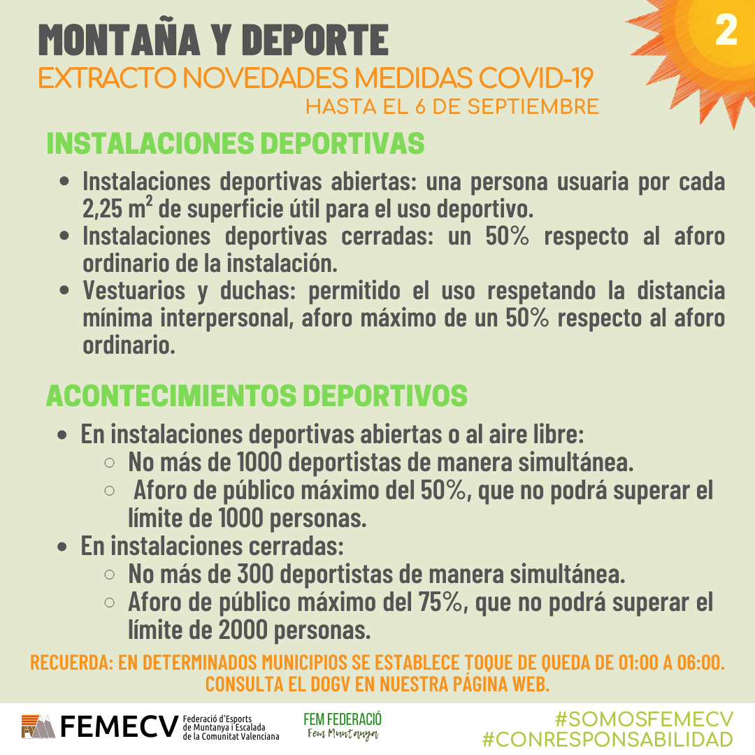 Por ello, se establecen medidas de las que destacamos las que nos afectan a nivel deportivo y de montaña, teniendo en cuenta que está permitida la práctica de nuestros deportes federativos, al aire libre, instalaciones abiertas o cerradas y sin contacto físico.
