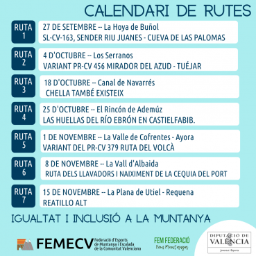 Es por ello que, de manera conjunta, la Excma. Diputación de Valencia y la Federació d’Esports de Muntanya i Escalada de la Comunitat Valenciana (FEMECV), han programado una serie de rutas con las que incrementar esa presencia y acceso a la montaña.