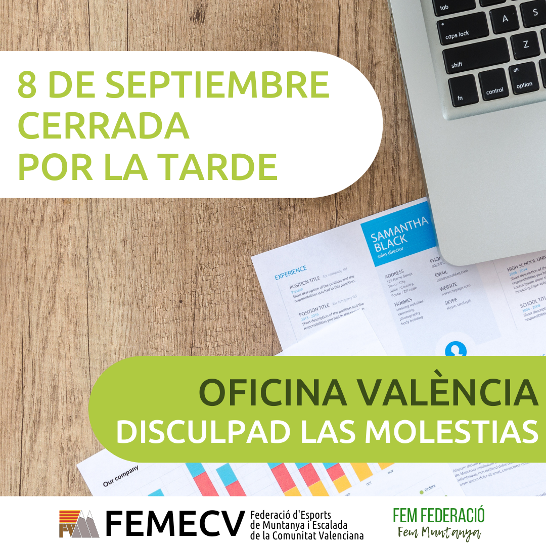 Aunque en el nuevo horario con el que empezamos el mes de septiembre los martes y los jueves por la tarde nuestras oficinas ofrecen atención presencial al público, hoy día 8 de septiembre, la oficina de Valencia permanecerá cerrada en horario de tarde, por cuestiones de trabajo interno.