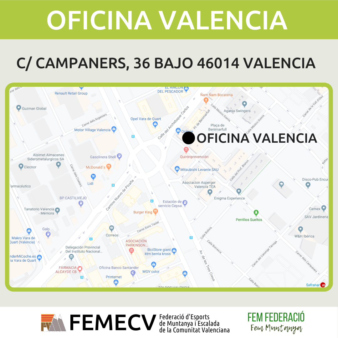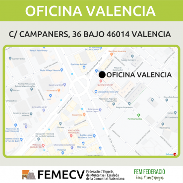 Una de las prioridades de la Junta Directiva, tras su elección a finales de 2018, fue la de acercar la Federación a las federadas y los federados. Por eso, se buscó una oficina en Valencia, desde la que atender a las personas pertenecientes a las provincias de Castellón y Valencia. En la Asamblea General de noviembre, en la aprobación de nuestros Estatutos, se aprobó el cambio de sede, pasando a ser la oficina de Valencia la nueva sede.