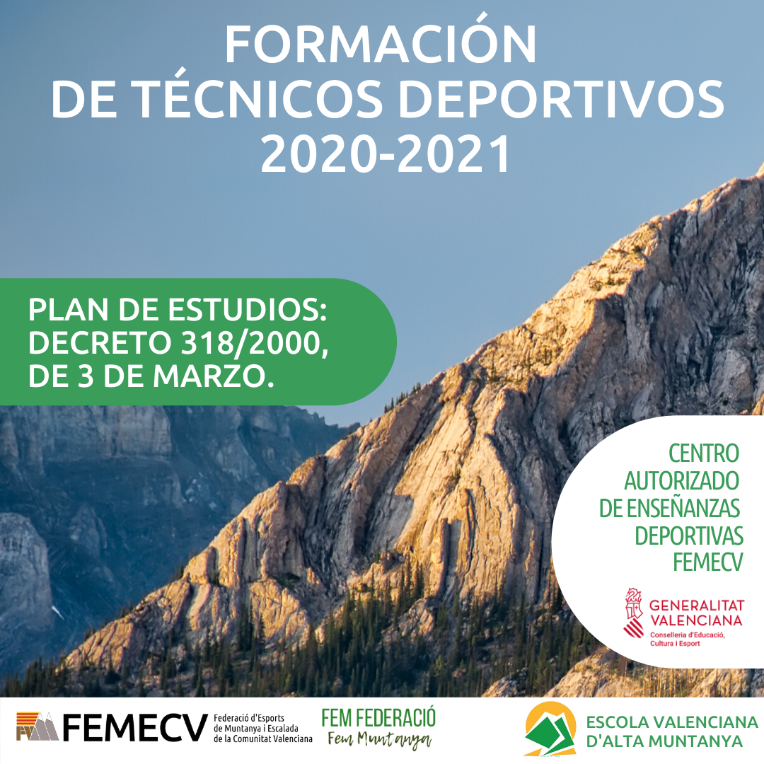 Desde el Centro Autorizado de Enseñanzas Deportivas FEMECV, se informa a todas las personas interesadas que respecto a las Enseñanzas de Régimen Especial de Técnicos Deportivos y Técnico Deportivo Superior en las especialidades de los Deportes de Montaña y Escalada, sigue vigente para el curso académico 2020-2021 en plan de estudios correspondiente al REAL DECRETO 318/2000, de 3 de marzo.