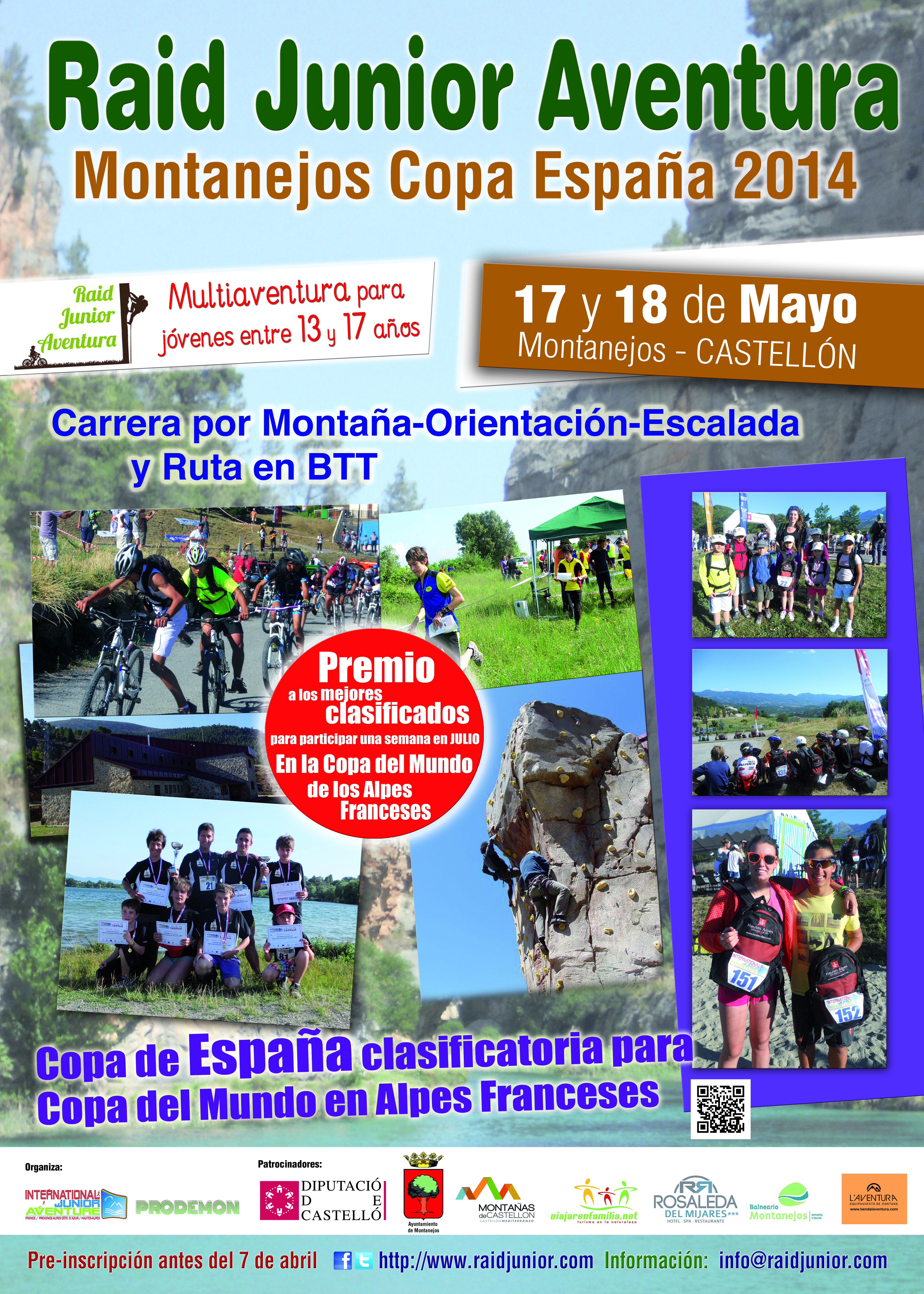 El Raid Montanejos Junior Aventura Copa España 2014 se enmarca dentro de un proyecto de cooperación internacional y europea entre varios países europeos y Quebec, promoviendo el deporte juvenil y familiar en las zonas de montaña, así como el desarrollo local a través de actividades y eventos turísticos-deportivos. Los jóvenes ganadores de las dos modalidades del Raid Montanejos tienen como premio especial por su esfuerzo una plaza con parte de los costes pagados de la cuota de inscripción para participar una semana de julio en la Copa del Mundo de la Federacion Internacional de Raids juveniles de aventura en los Alpes Franceses.